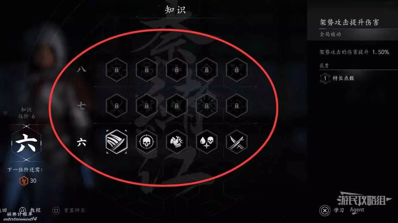 點擊下圖圈出的“六”就能看到知識路徑,多出來的技能點就可以用在這裡,以提升各種屬性增強能力。