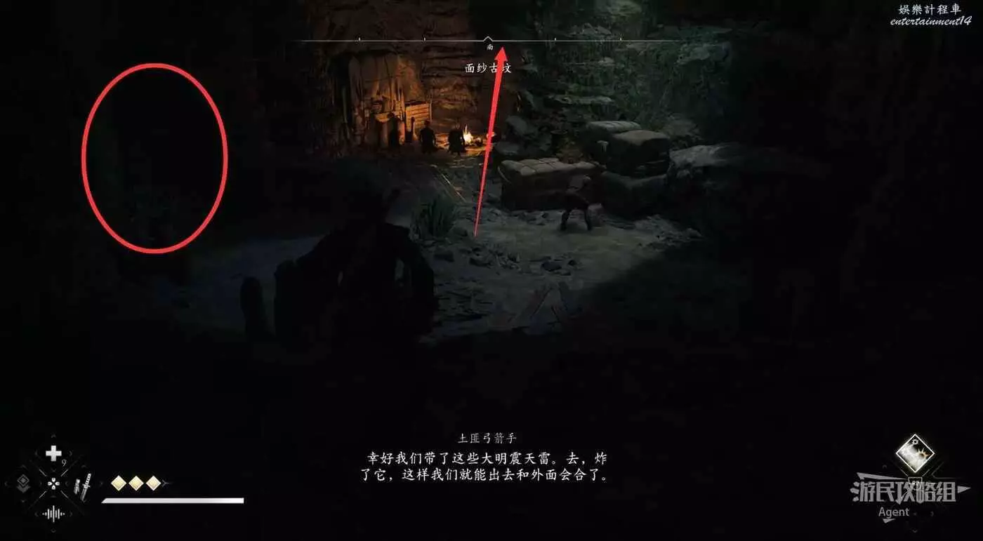 先炸開對面高處的路,進去拿個小寶箱,然後再射爆旁邊的炸藥就能出來,出來後,面前的剛好就是接下來要走的主要路線。