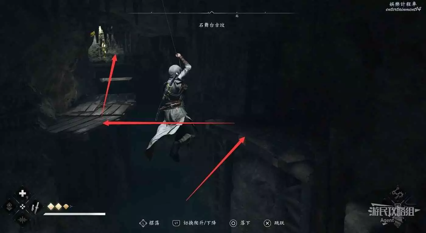 接下來往下滑然後使用鉤繩,中間的柱子可能會跳不上去,可嘗試在擺蕩時下降以延長繩子然後再跳。