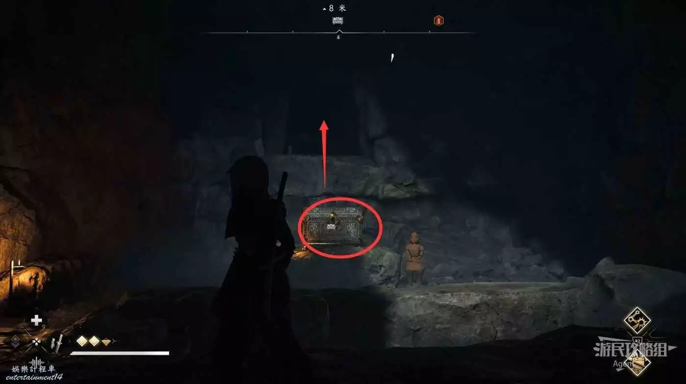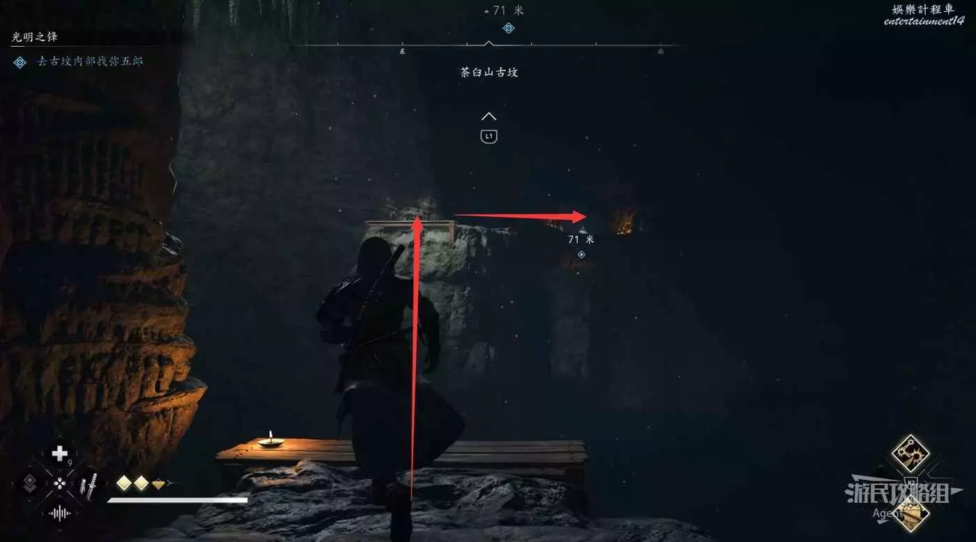 來到下圖位置,先去右邊鑽進狹縫拿個小寶箱,然後再用鉤繩跳到對面。