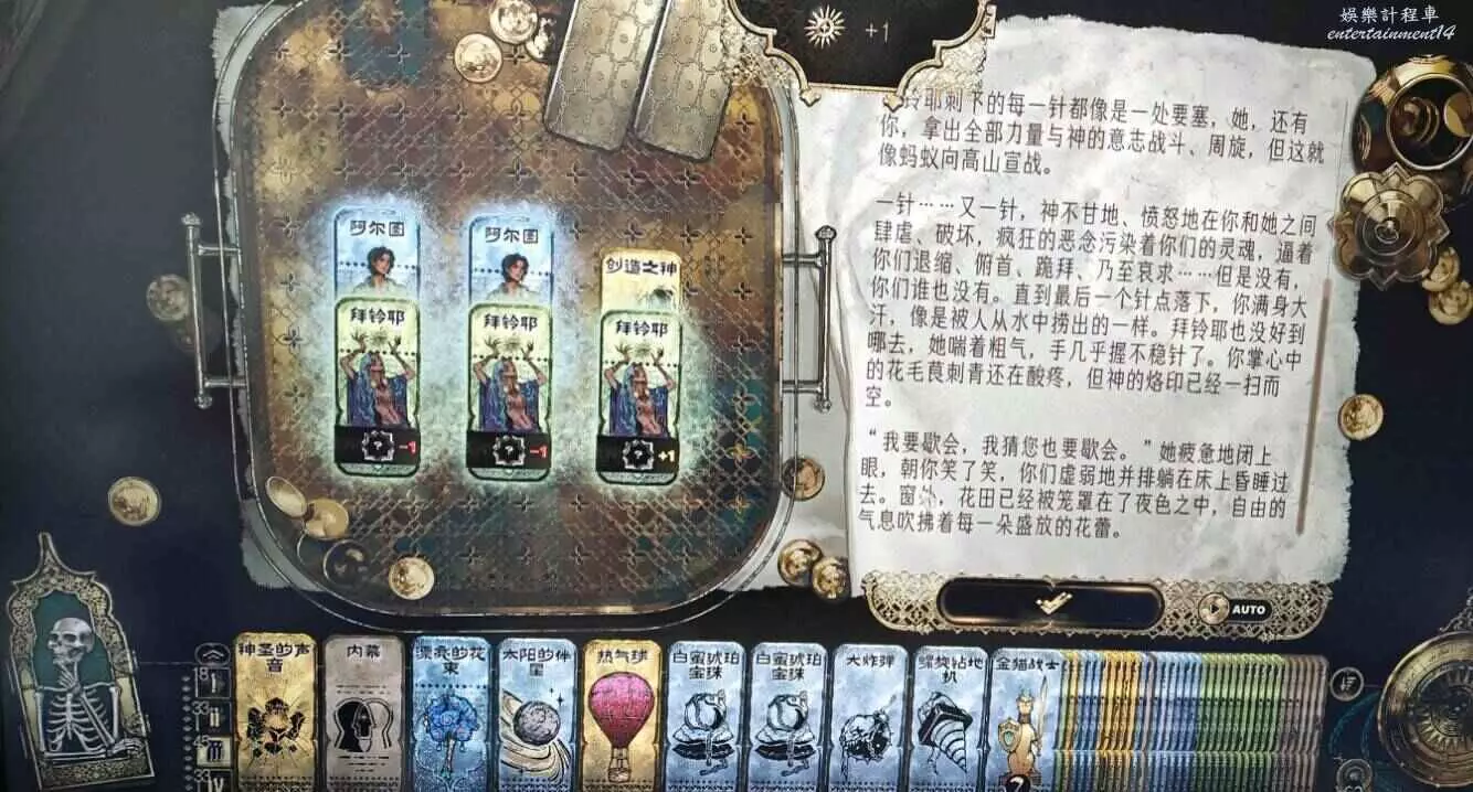 7.在“神啊,降臨吧”事件中放入密教思潮(應該無品階限制),再放入3級以下的密神面容(需要在心靈之戰中用對應品級的密教思潮思辨,每3點連結觸發事件升級一次,升級會清空懷疑。),以上放置物應該不是唯一解,但我這樣放成功觸發了下一步事件
