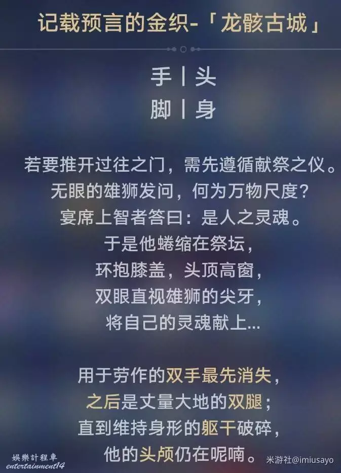 在收集完該地圖的若蟲後,衣匠會提示你有只若蟲頂了個球且此蟲的叫聲與眾不同,然後給你一個預言,預言如下圖。在做完主線之後,會有一個支線任務《蟲鳴秘寶》,在這裡有三波解謎和球有關的解謎,解謎完之後的螢火**會提示你,這地方還有一個隱藏的解謎方式。