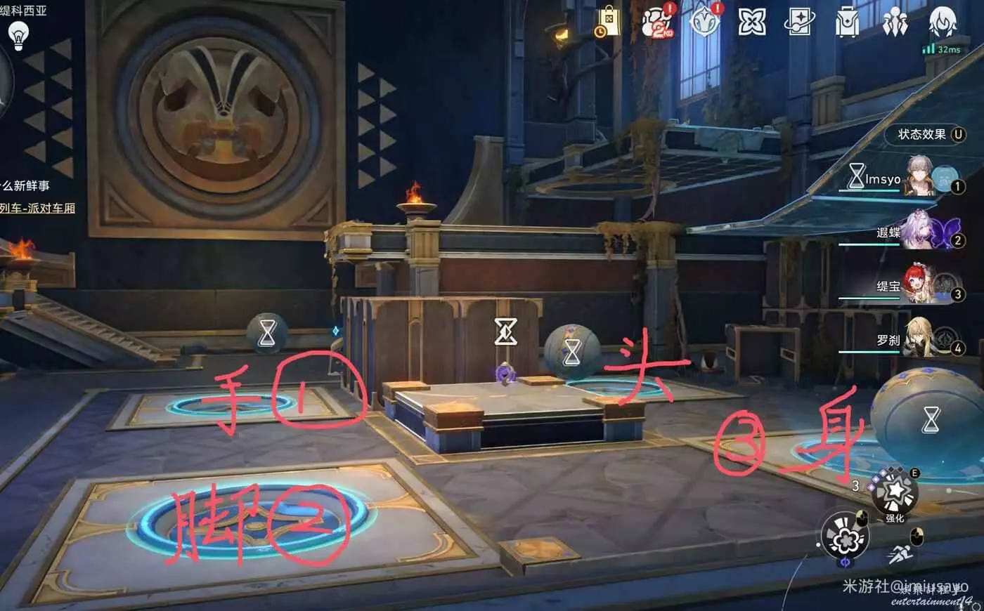 按照預言所說,手先消失,意味著手先進球,腳緊隨其後,因此腳的球要第二個進去,身子的球第三個進去。為了達成這一順序,我們需要先把球全都打壞,然後把球先停成如下圖所示的樣子(2球和3球要先到壓力板中間),不然順序會錯。