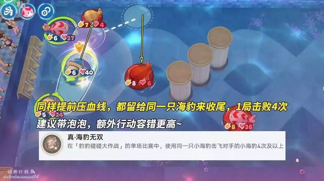 《豹歉,你也想起舞嗎?》建議主動壓低對方血量,確保下一次可利用彈射軌跡,觸發‘雙重豹殺’一次性擊敗對方2只海豹。