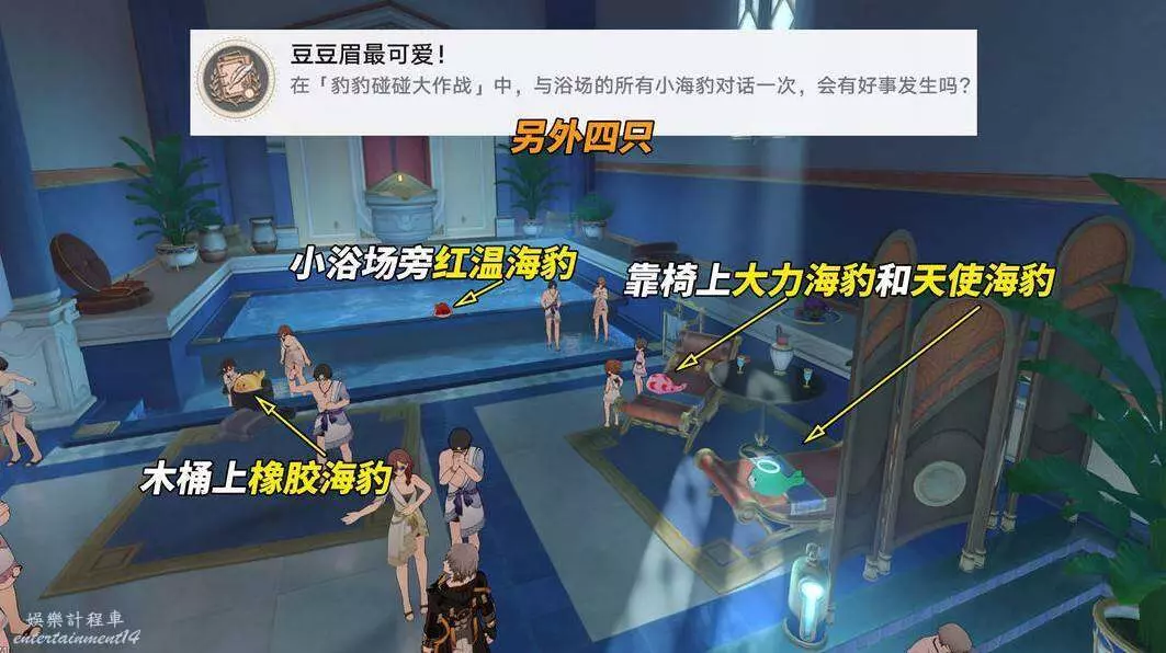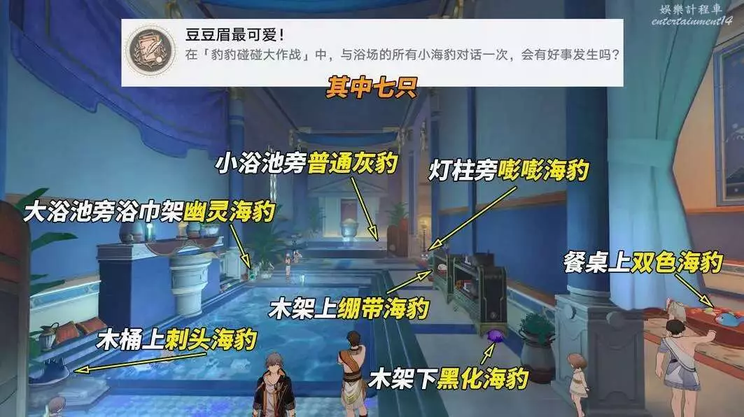 《豆豆眉最可愛!》劇情模式做完,與當前區域內所有海豹都對話1次,即可觸發。一共11只海豹,部分隱藏較隱蔽,找不到的玩家可重點排查以下幾個區域‘浴池圍欄不起眼的普通灰豹、活動入口NPC阿波菲斯背後浴巾架、浴場木架底下、浴場外餐桌上’。