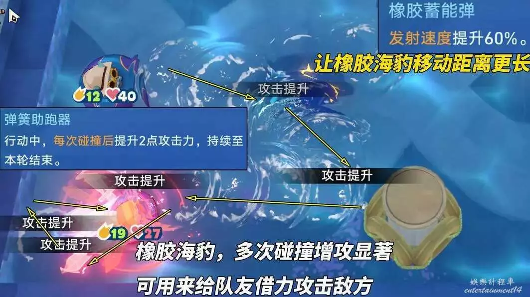 ②輪到橡膠海豹行動,利用其每次碰撞攻擊+2的特性,不走尋常路線,多依靠場地障礙物反彈,碰撞越多攻擊增幅越高。尤其是在解鎖祝福橡膠蓄力彈‘發射速度提升60%’,移動路徑長度大幅提升,無論是出傷還是疊攻擊,都有顯著提升!