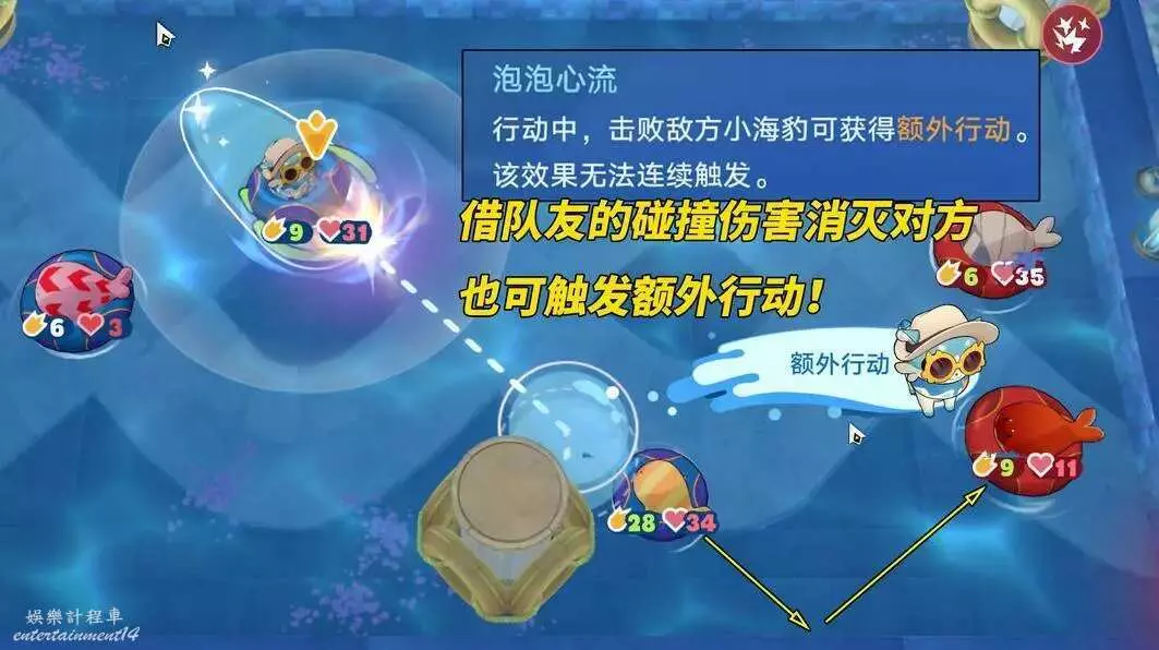 ③最後用奇美拉泡泡收尾,通過撞擊前面已疊加高額攻擊力的橡膠海豹來攻擊敵方,可讓敵方扣血更多。只要在泡泡的行動中,無論是通過隊友碰撞還是其他方式擊敗敵方,都可觸發額外行動,可再動1次。