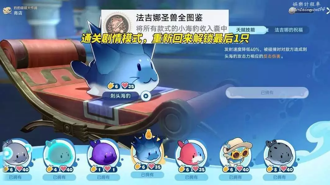 《法吉娜聖獸全圖鑒》最後一隻‘刺頭海豹’需要擊敗賽飛兒後,主動前往主介面的商店解鎖。搭配‘大力海豹’協助衝撞,強度還不錯,後續打上強度關卡時可以考慮使用~