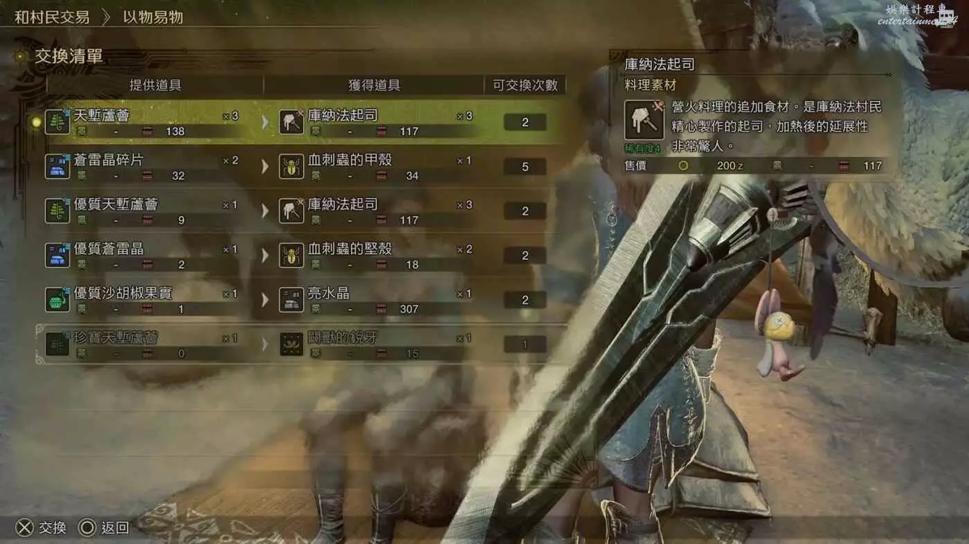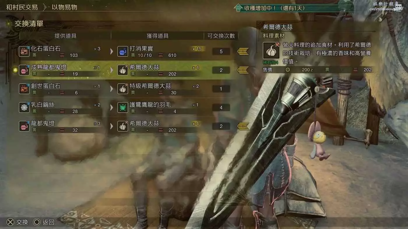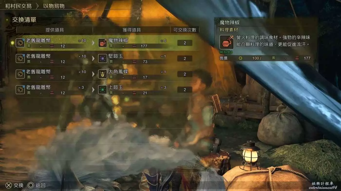 除了流水草等部分屬性彈合成素材因為刁民收集效率跟不上消耗速度,其他普通食材、爆炸菇麻痹菇(鬼人藥和硬化藥)、鬼人硬化種子、雷光蟲、眠草、蜂蜜……基本上都可以靠這個以物易物和刁民採集系統,滿足日常需求。