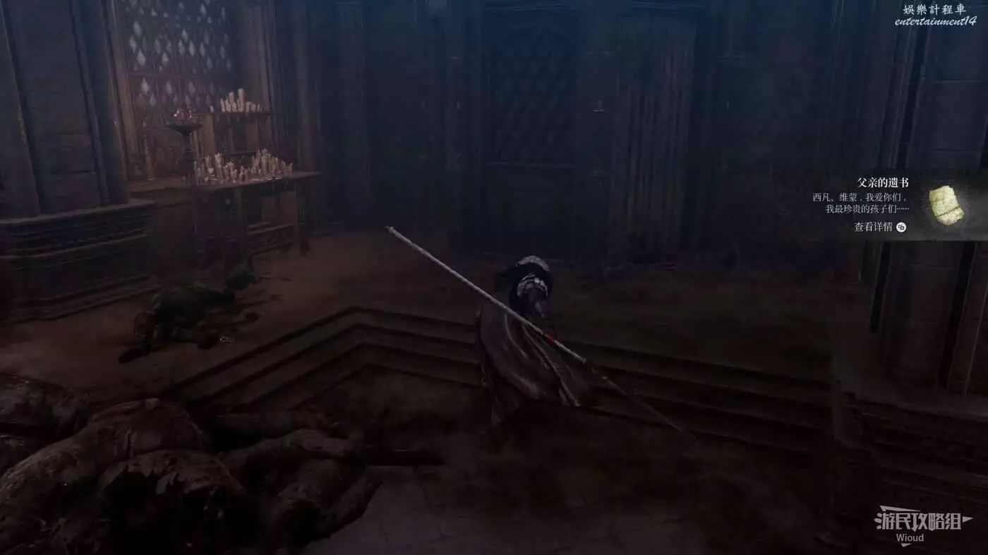 寶箱位置轉頭進入後方建築,入口右側蠟燭位置可以撿到收集品【染血的護衛軍記錄】,與深處的柵欄門互動開啟近路。