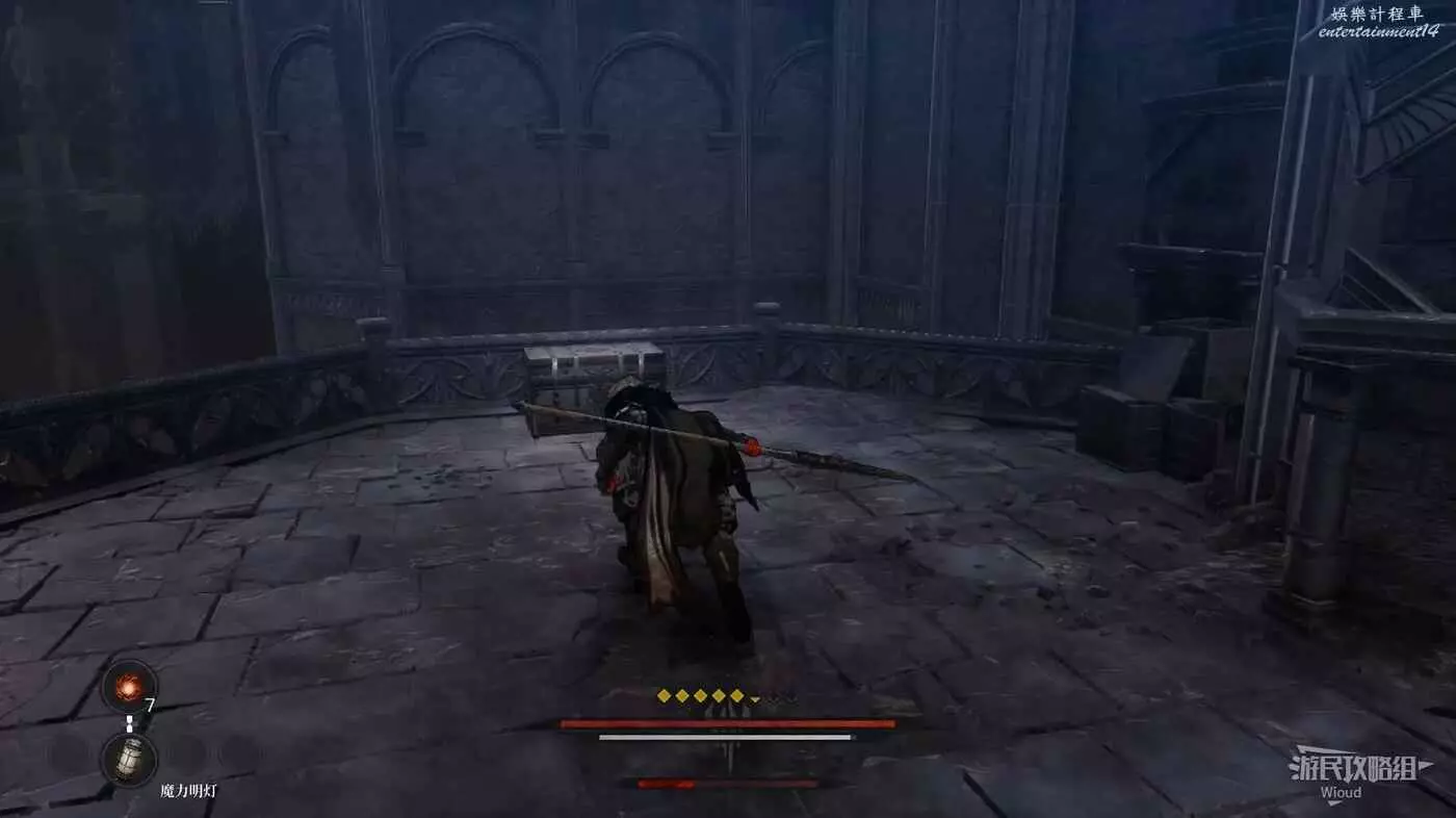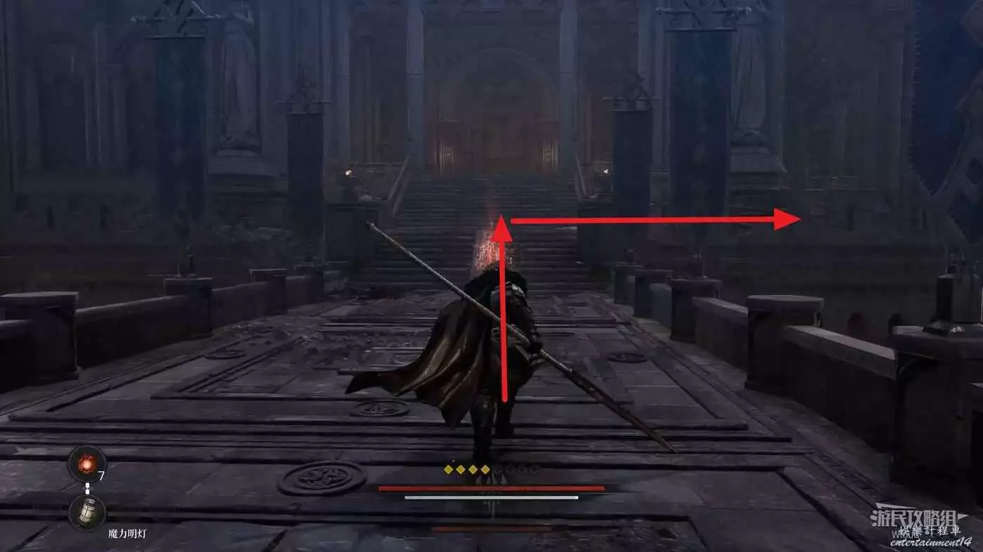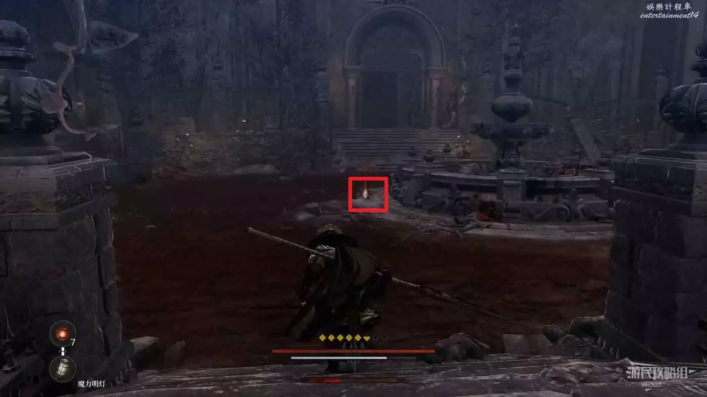 啟動篝火與NPC對話,沿著旁邊入口樓梯往下走,直到到達下圖建築大門前,中間樓梯往右走,有個道具。