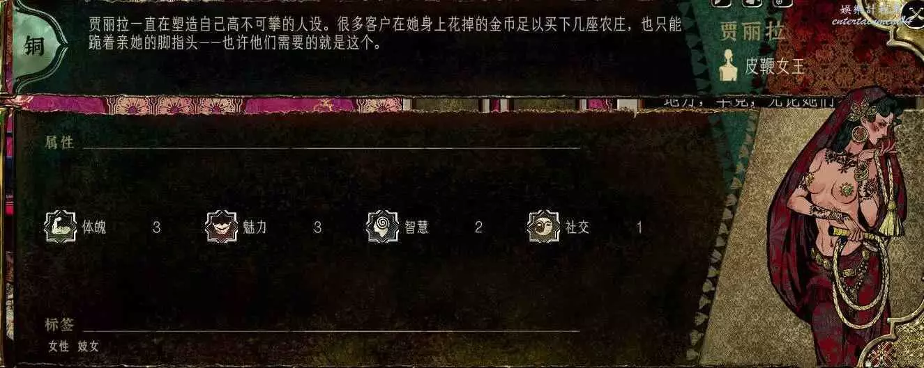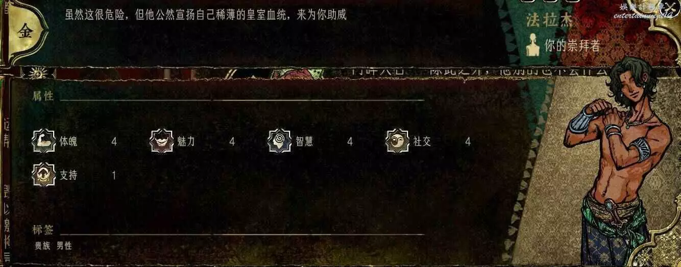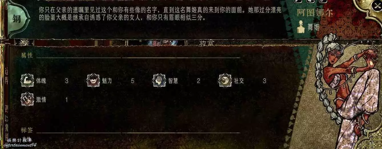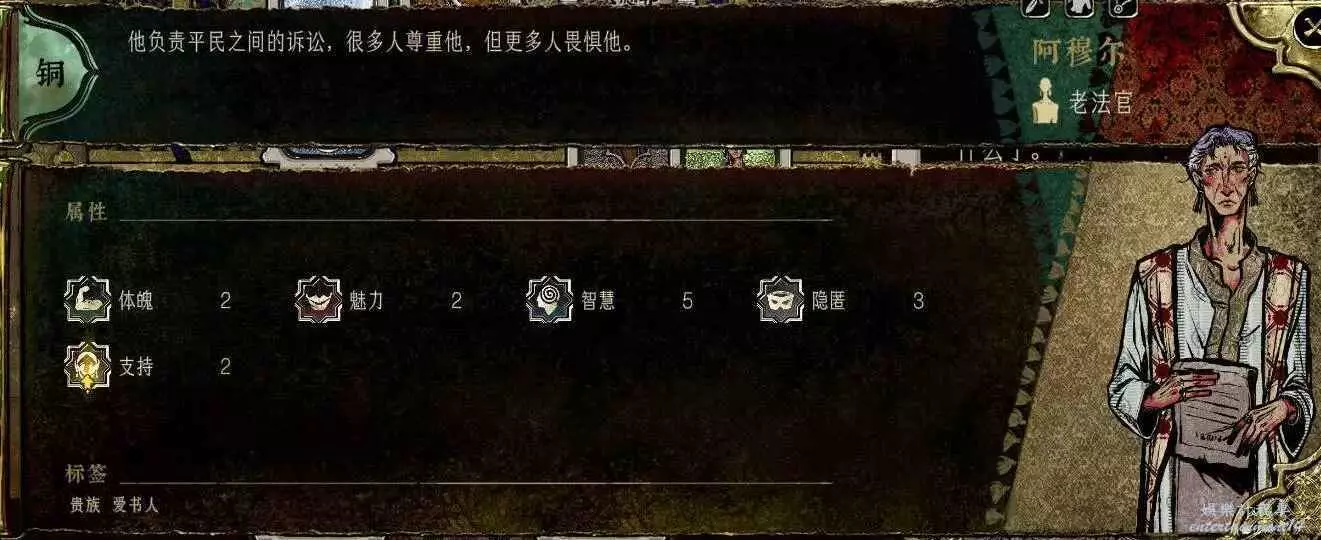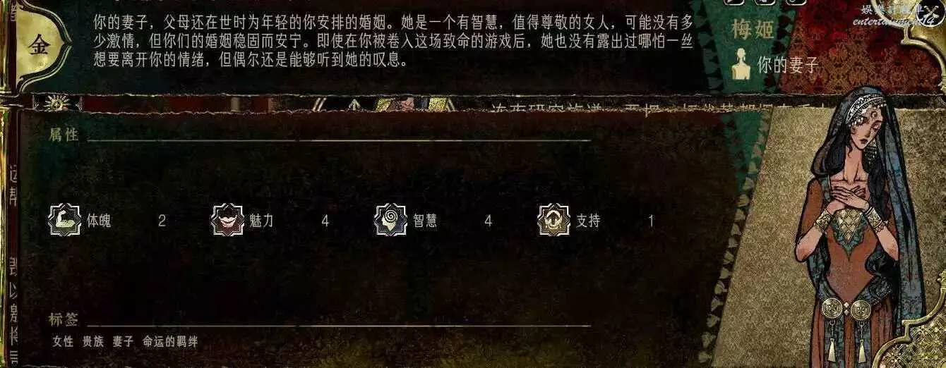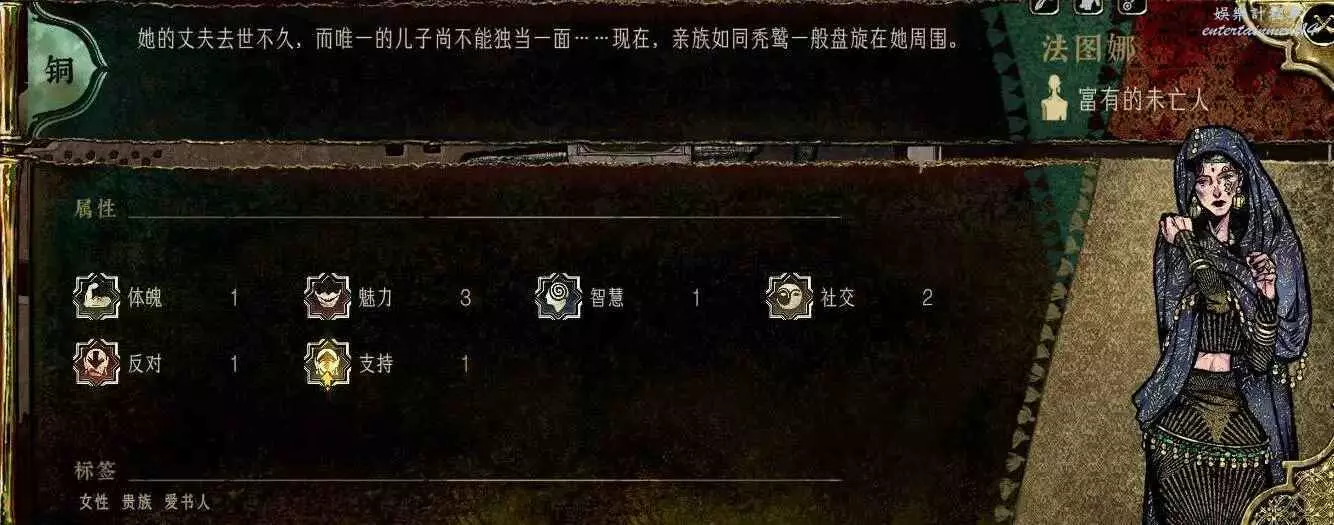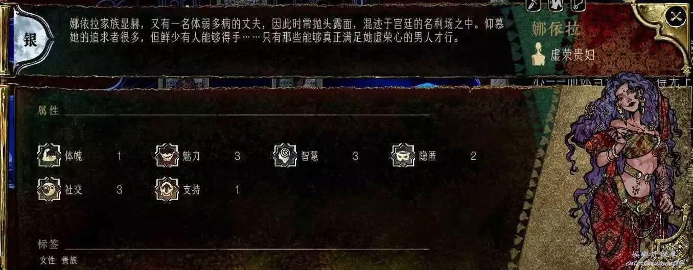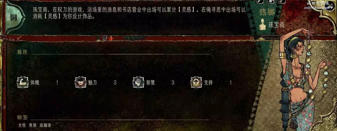 前期角色,屬性非常差,妝後有5魅4隱,比較一般,4隱比較稀有,強綁兒子,前期拿到手幹雜活就好。任務給不少錢。智力太低了。唯一用處高支持也被法官完爆。