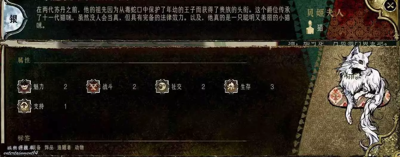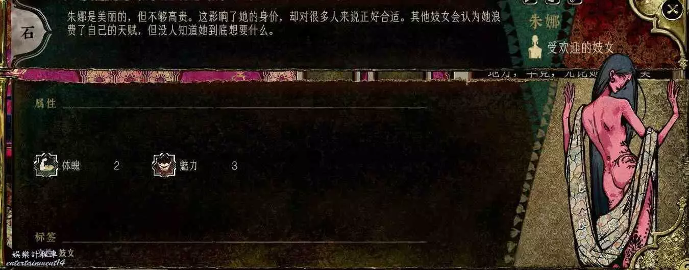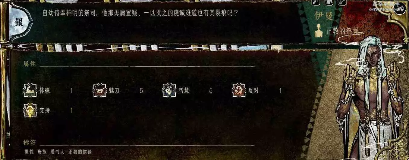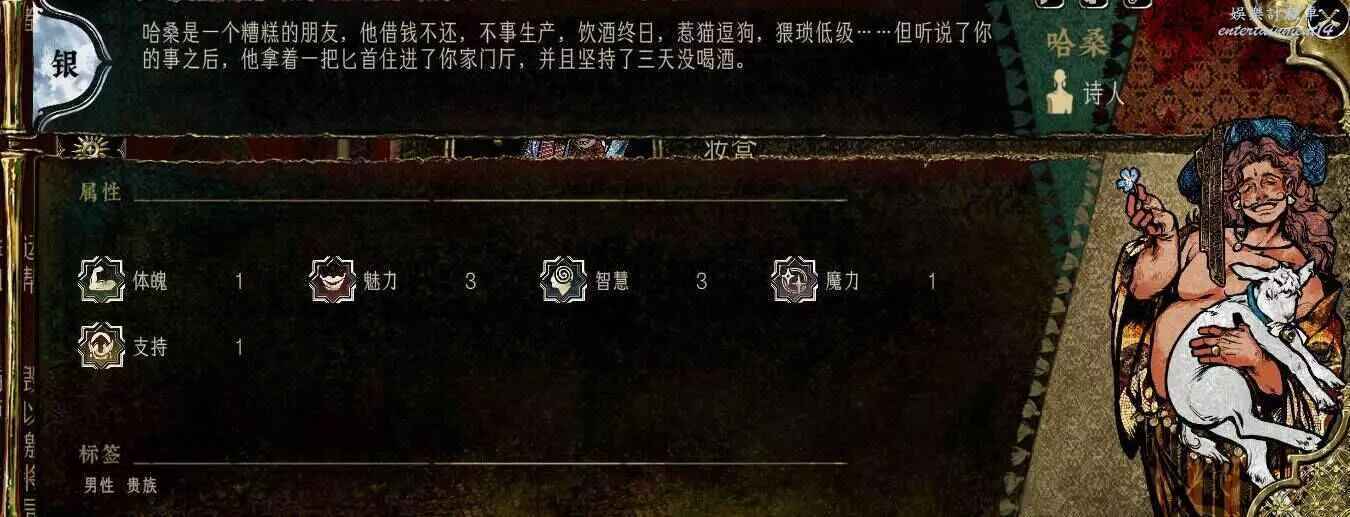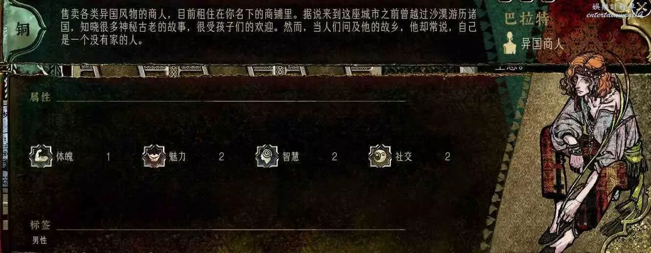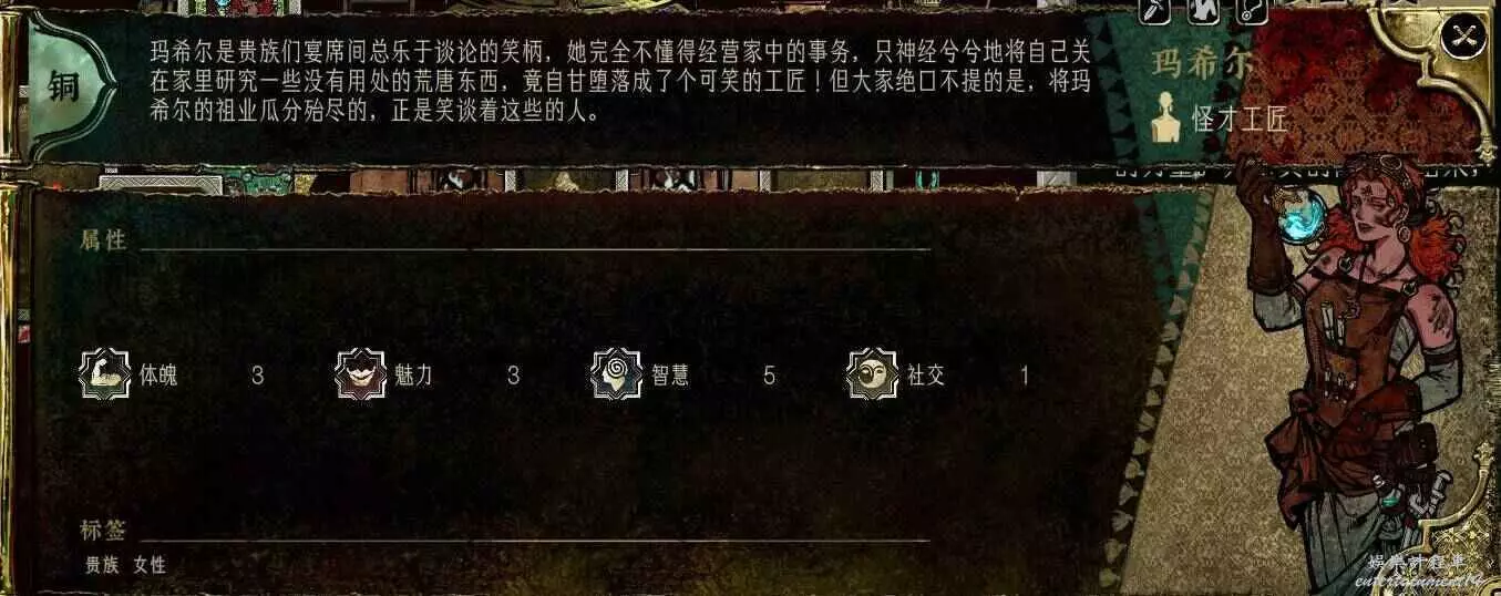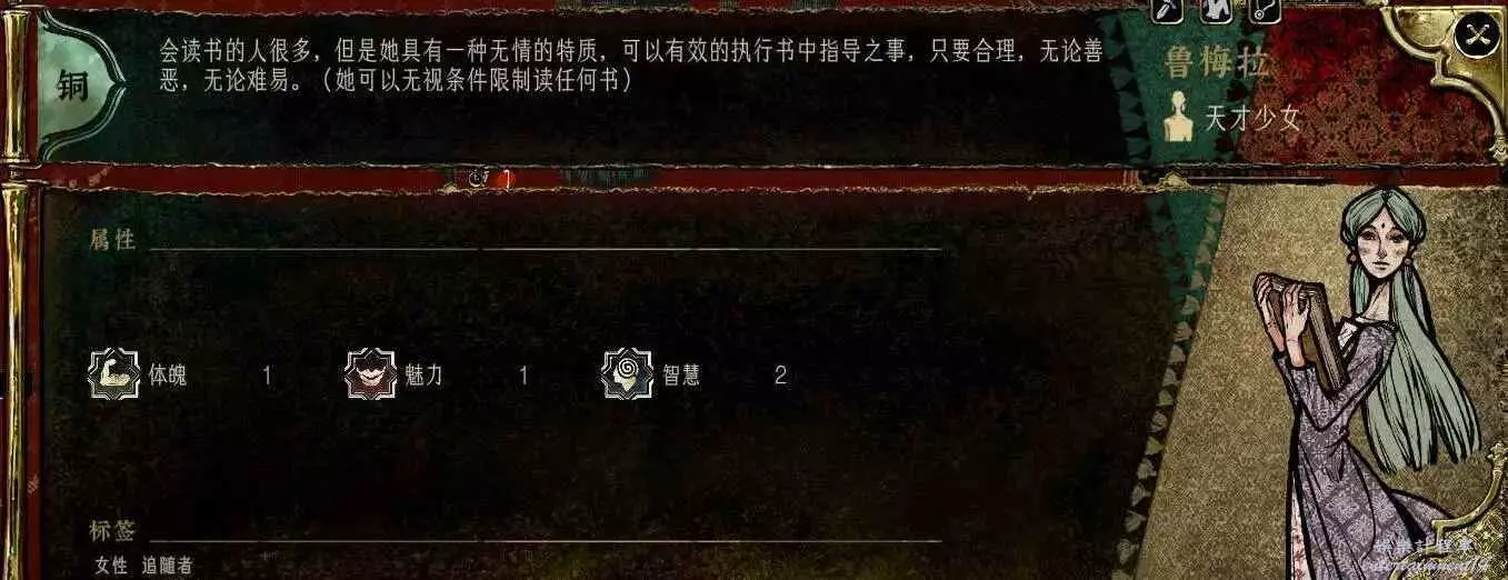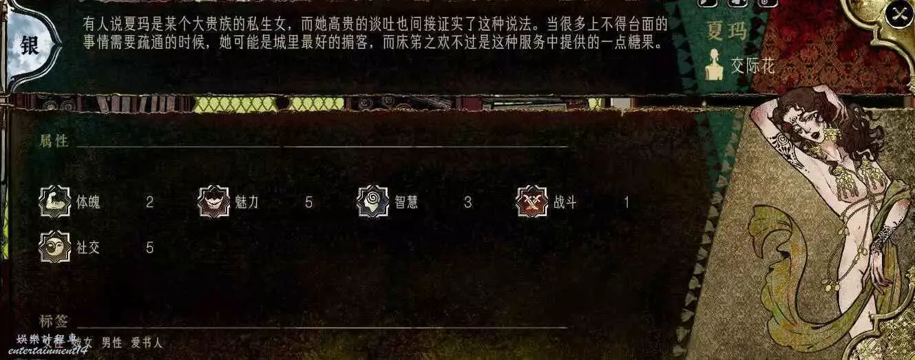 前期角色,屬性非常差,妝後有5魅4隱,比較一般,4隱比較稀有,強綁兒子,前期拿到手幹雜活就好。任務給不少錢。智力太低了。唯一用處高支持也被法官完爆。