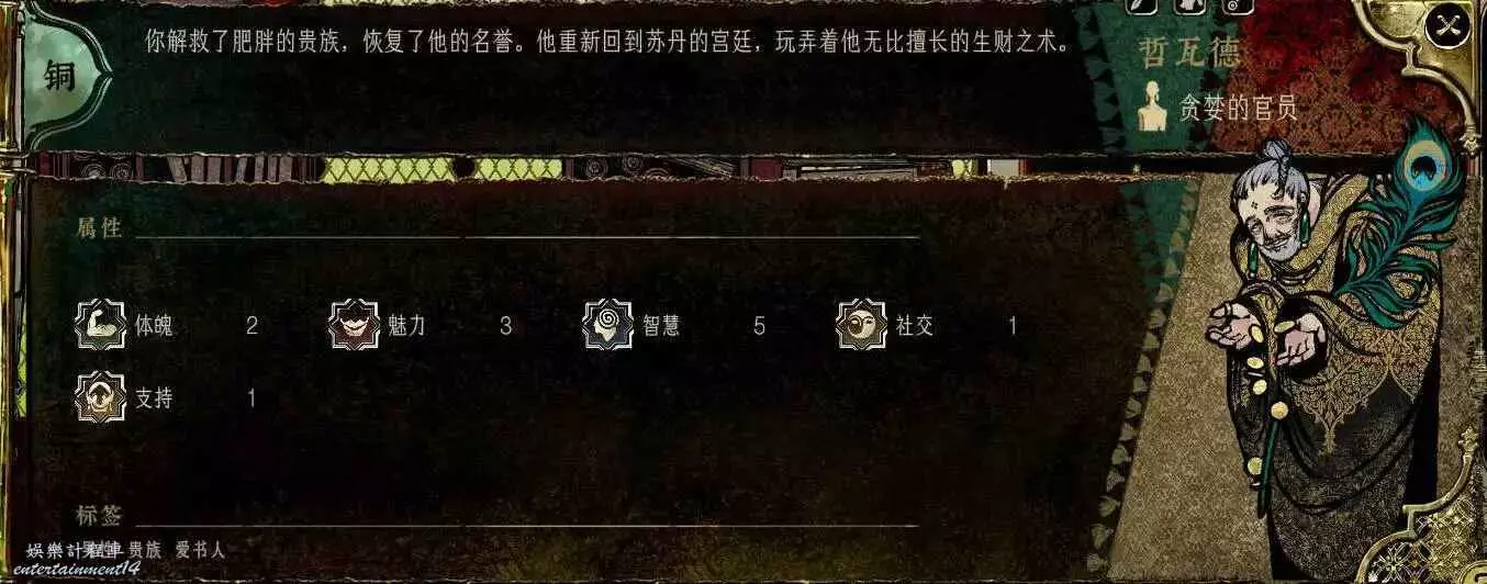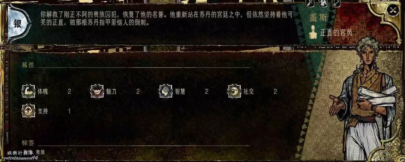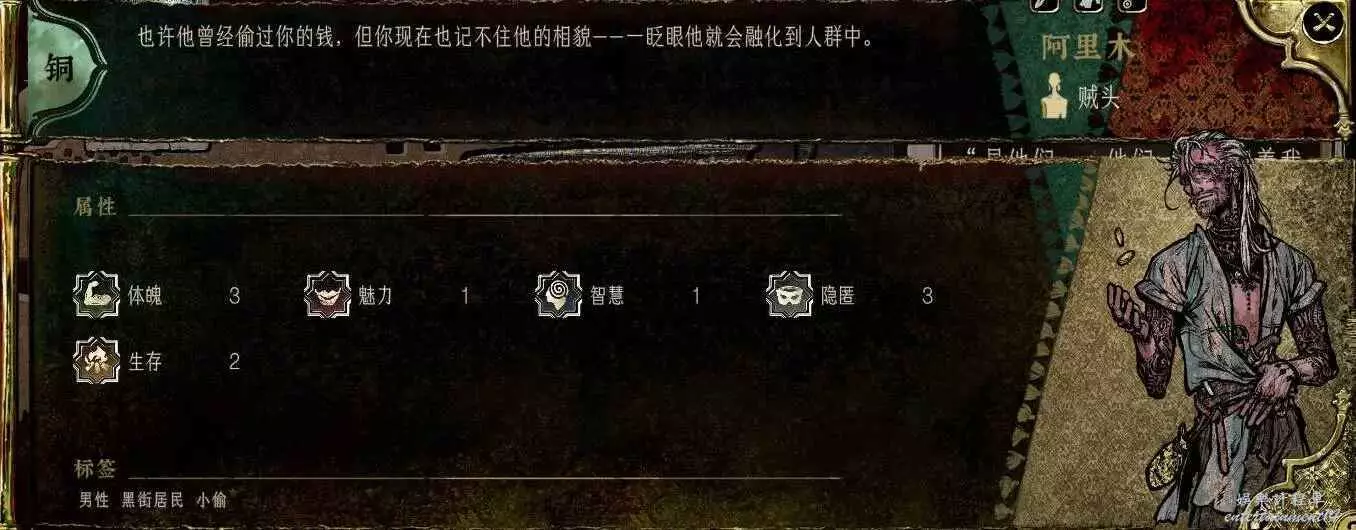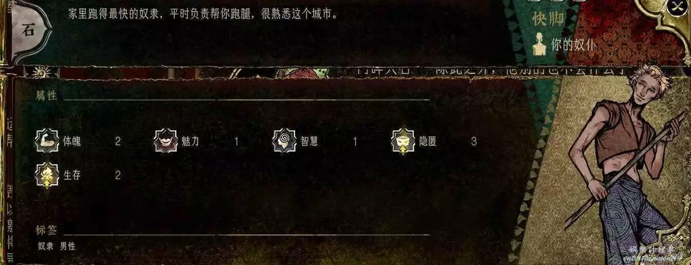這老頭化妝裝成了貴族,隱匿5,應該是最高的了。但是智慧太低,任務線還長,回報少,沒什麼培養價值。