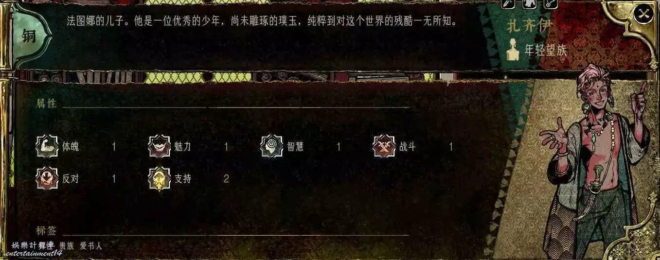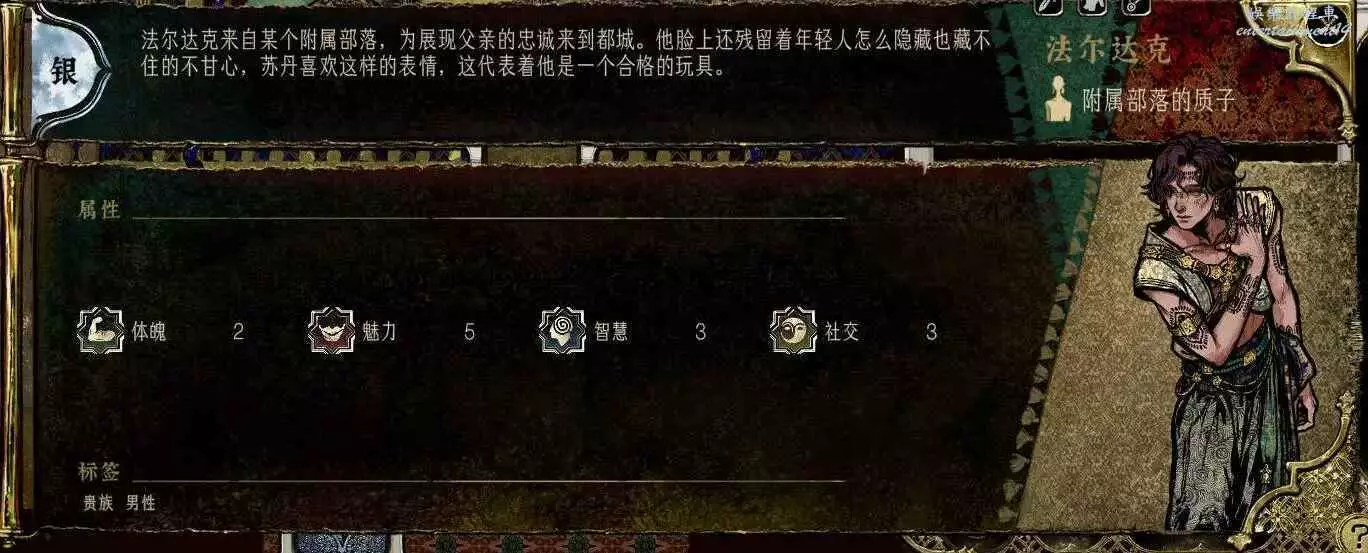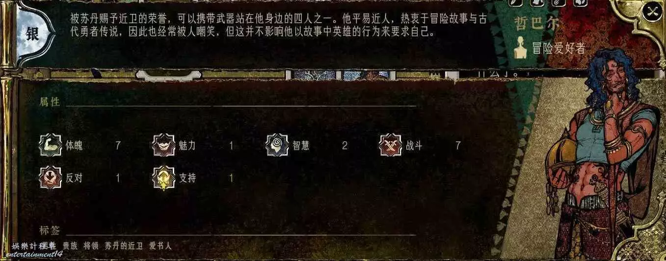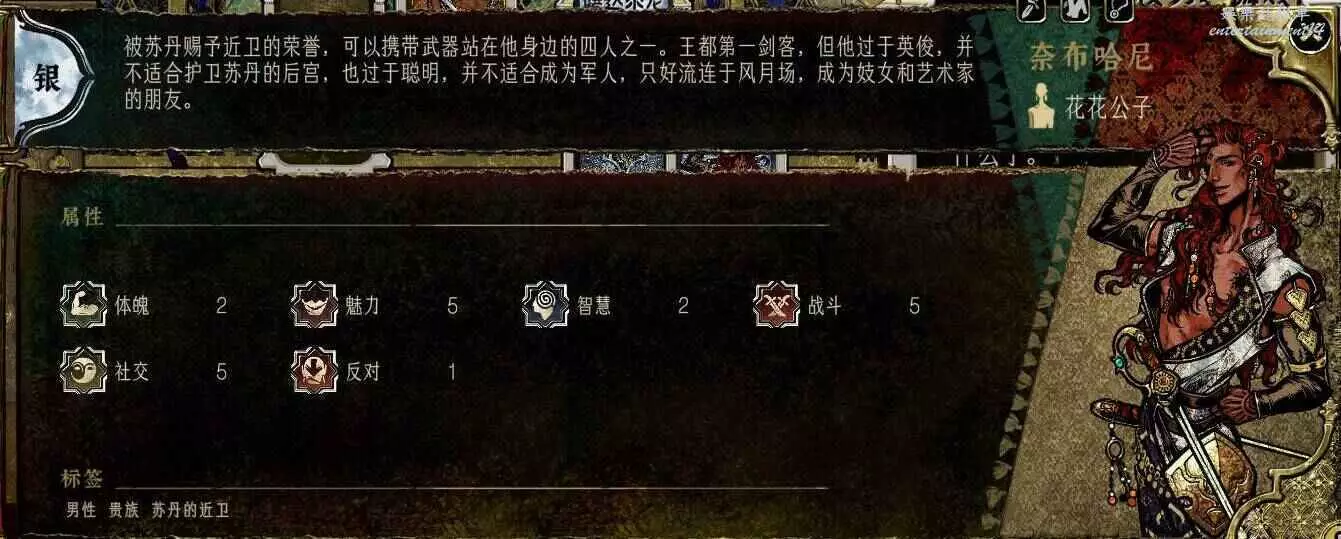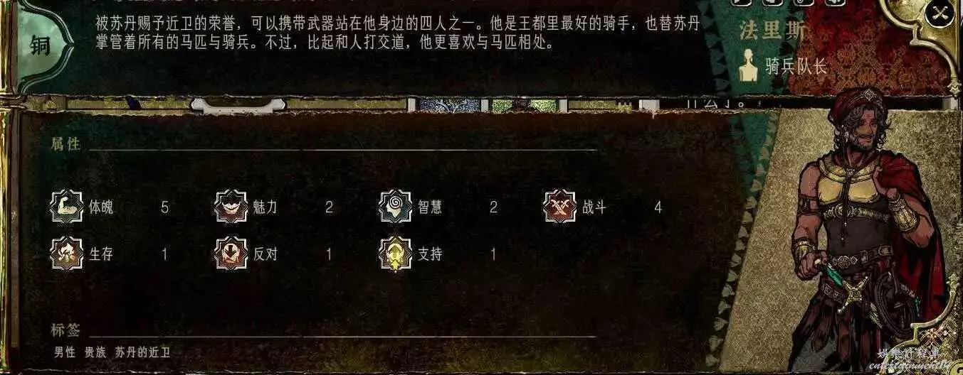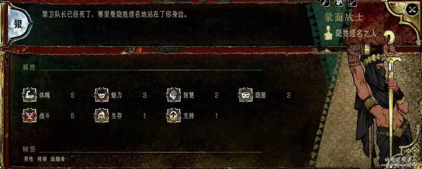 基礎數值僅次於哲巴爾,其他比蒙面大一圈,雙刀讓他也非常適合培養,沒繡娘一樣能打,難點在入隊條件,上貢金幣到5權勢,然後看事件,極限兩周就能拿到,成本低,而且後續任務線回報高,直接影響最後的造反結局,配得上金卡的身份。無論是數值,裝備,還是對結局的影響,都值得一個T0。