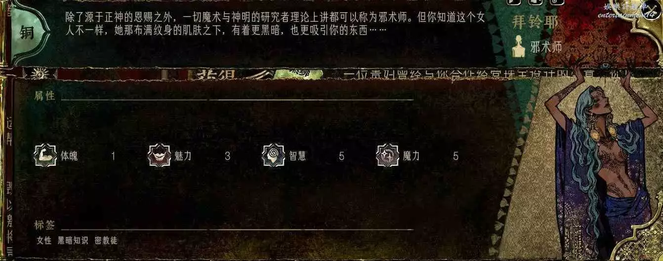 雖然基礎數值低,但是女兒可以隨便讀書。上限非常高,後期入聖屬性暴漲,飛升省去20魔力判定。雙飾品能把魔力或其他屬性疊的非常高。問題就是培養週期太長,需要多回合投入。雖然全能,但是見效慢,只能跟哲巴爾並列T2頂。