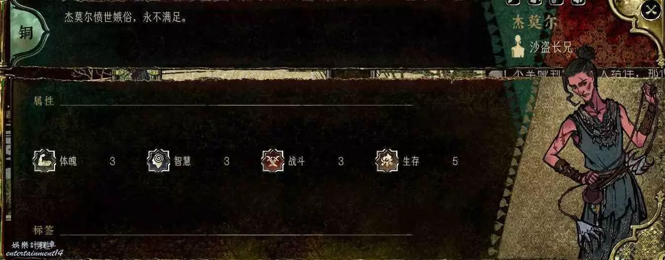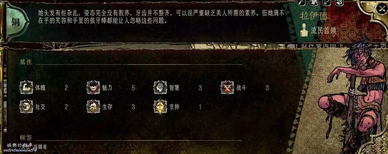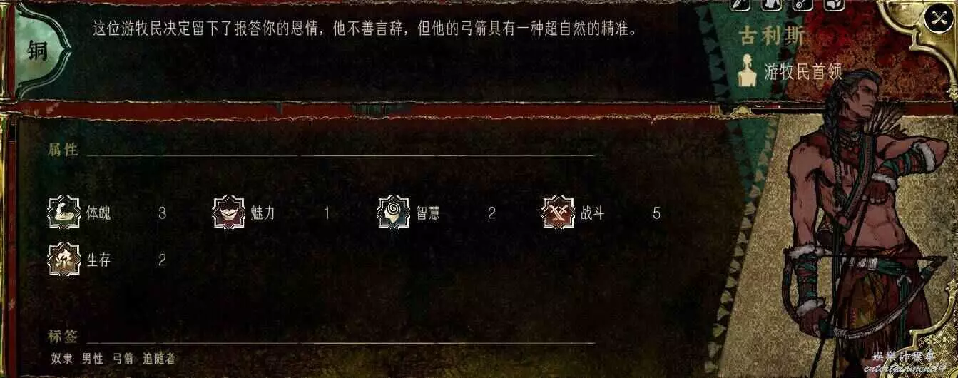 又是一個典型的戰鬥角色,除了戰鬥屬性外其他屬性很差,但是自帶馴獸,能拿就拿,拿不到反正有兩兄弟,誰吃鱷魚不是吃啊。