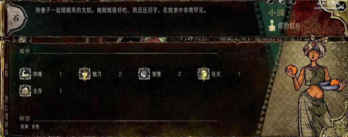 這種石卡基本只能靠劇情和化妝撐屬性,小圓的化妝差了,5生存,可是三奴隸已經有鐵頭和快腳了,小圓更應該是一個補充不足的作用,後續有個人劇情,可以稍微培養一下。因為綁定鐵頭,只能扔到T2末端了。前期出事件給個項鍊湊5魅力去叫奈布吧。家業可以補3個骰。