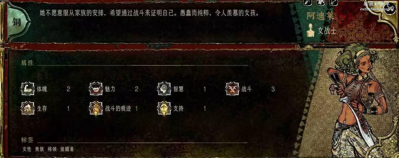 純粹的數值怪,先天的馴獸,妝後雙刀,甚至有魅力社交!不帶妝娘,大姐已經是超級鐵頭了,帶了妝娘,大姐直接成女武神了,阿迪萊?什麼虛假的女武神。基礎數值,極易的入隊難度,培養難度,上限,智力,魅力,都沒有我拉伊德大姐高。除了是貴族,還有啥?一個1智慧的無孩愛貓女罷了。法拉傑開局必吃榜。