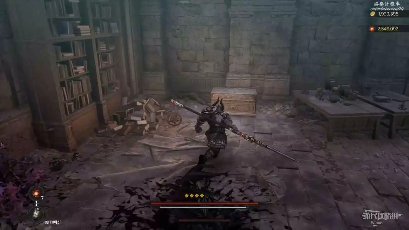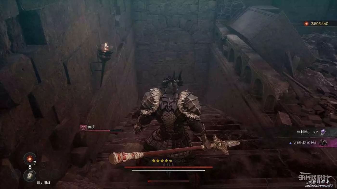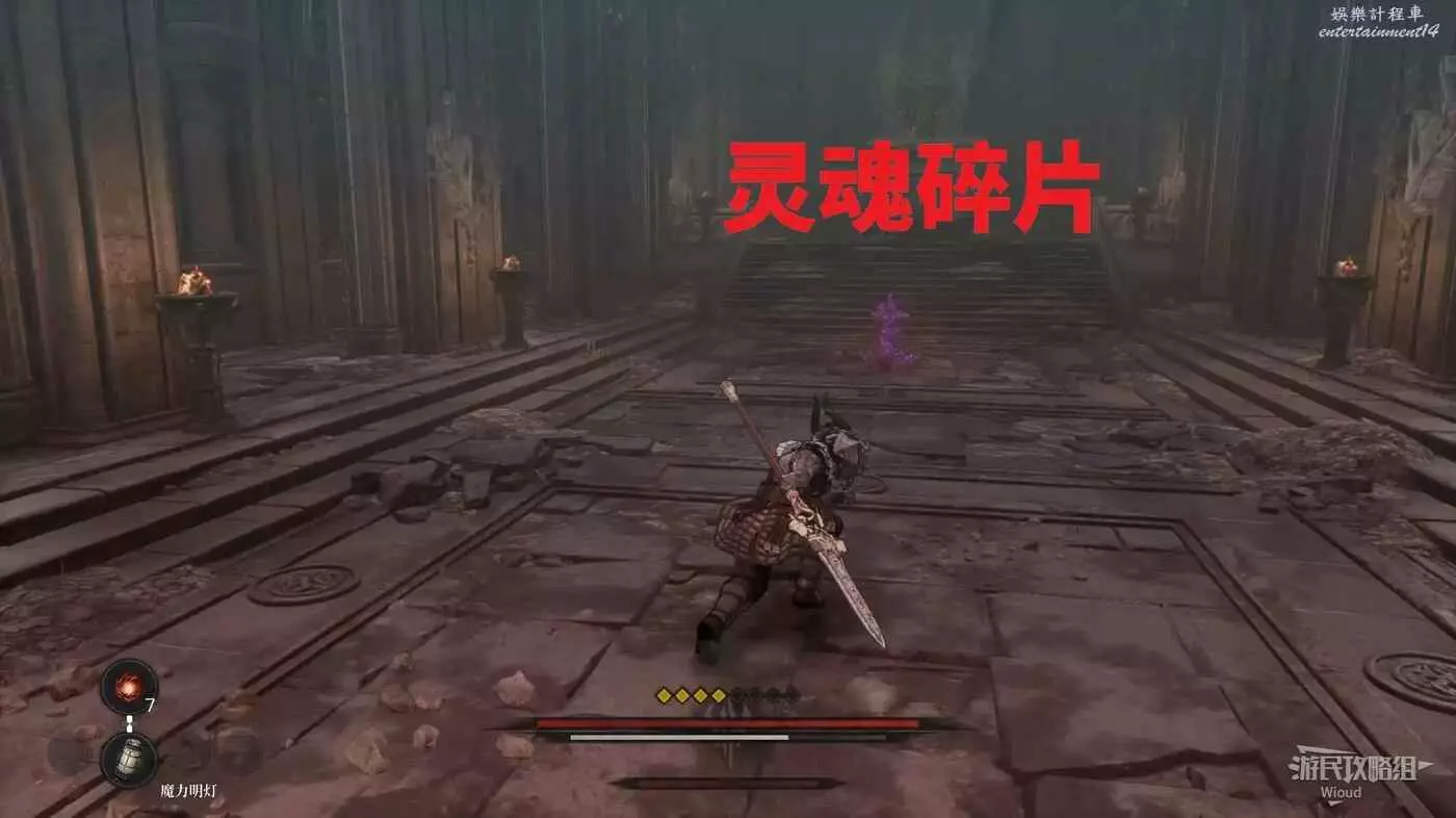 爬電梯前樓梯往上走一段距離啟動第一個篝火,篝火後面的禱告台後方屍體處可以撿一個【靈魂碎片】。