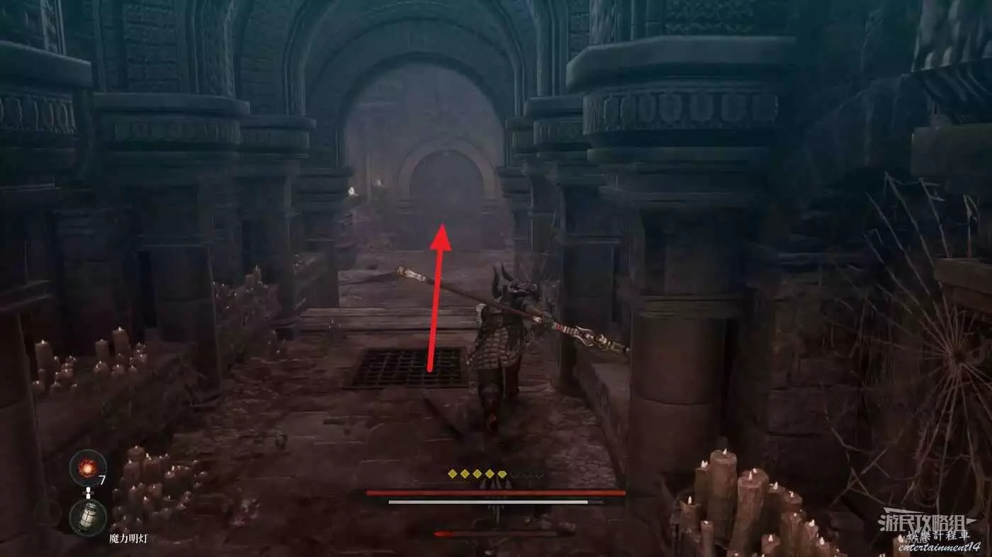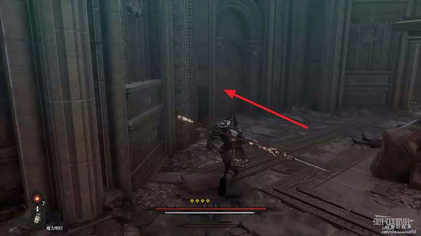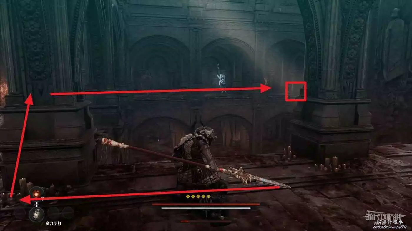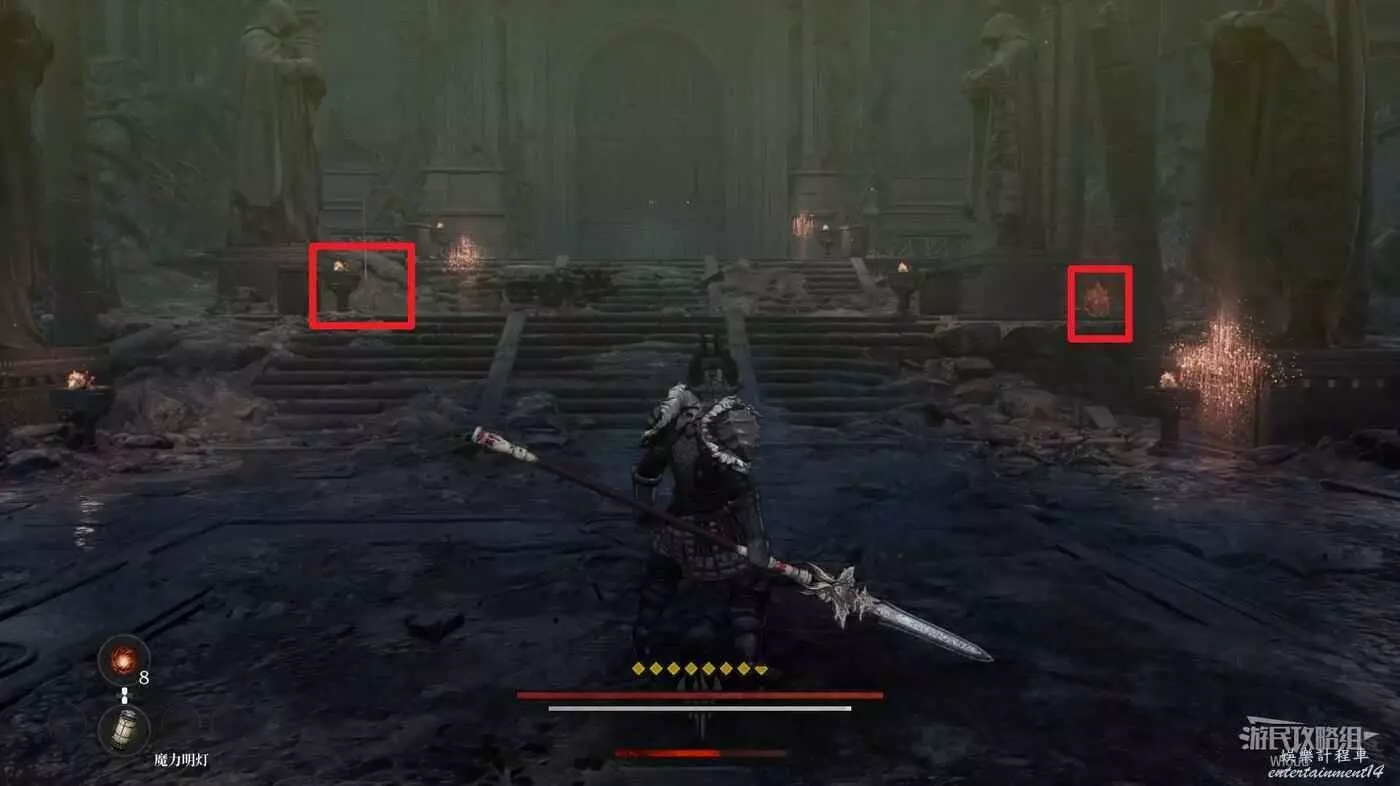 走到下方大門,大門左側雕像處紅點道具可以撿到【掠食者卷軸】,右側雕像後面藏著最後一個【鬼石】。