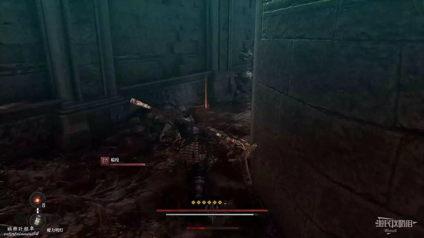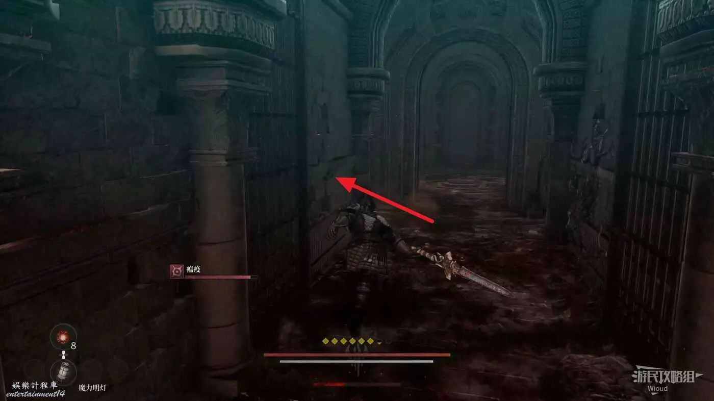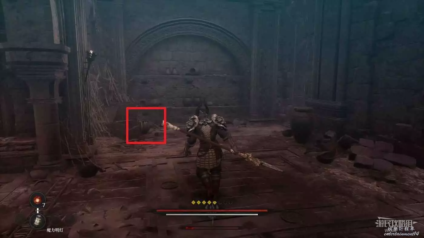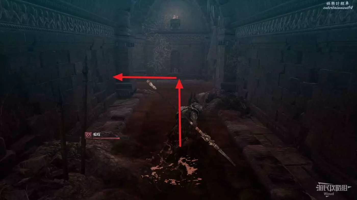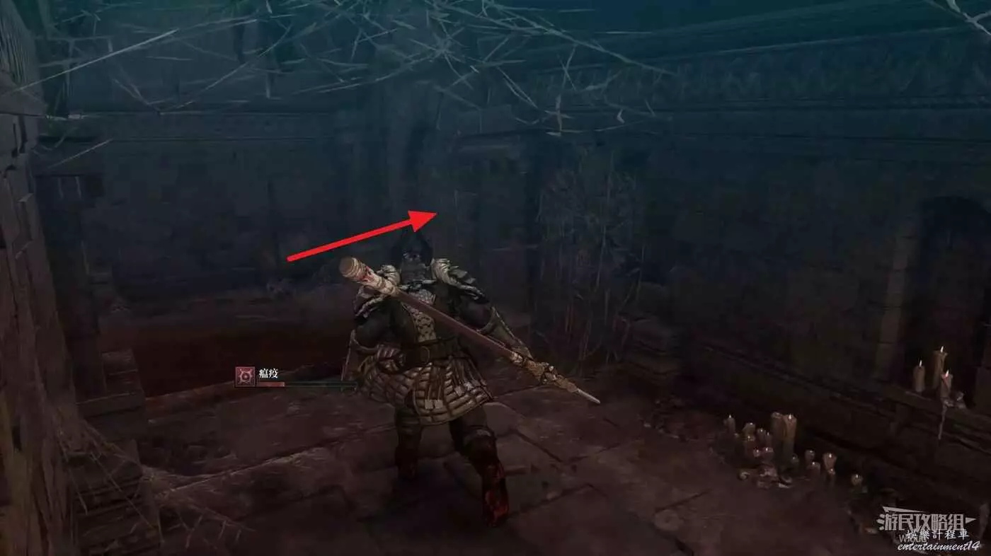 開啟大門,走廊左側屍體處撿一個【靈魂碎片】,篝火前左側的牆壁是一個假牆,裡面有個寶箱。