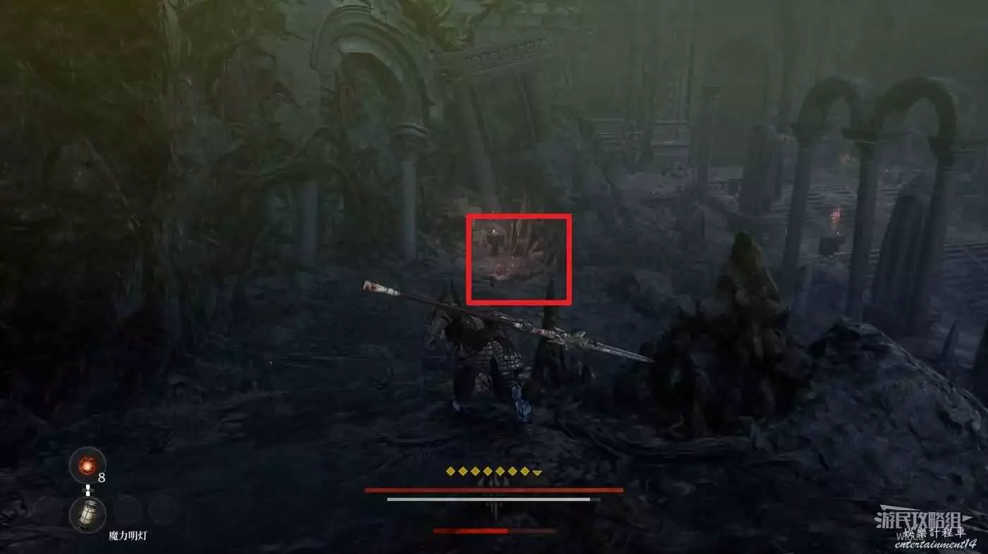 走到一個開闊區域的高台,沿著下圖路線繞到高台右前方角落,拾取道具獲得一個【冥界氣息】。