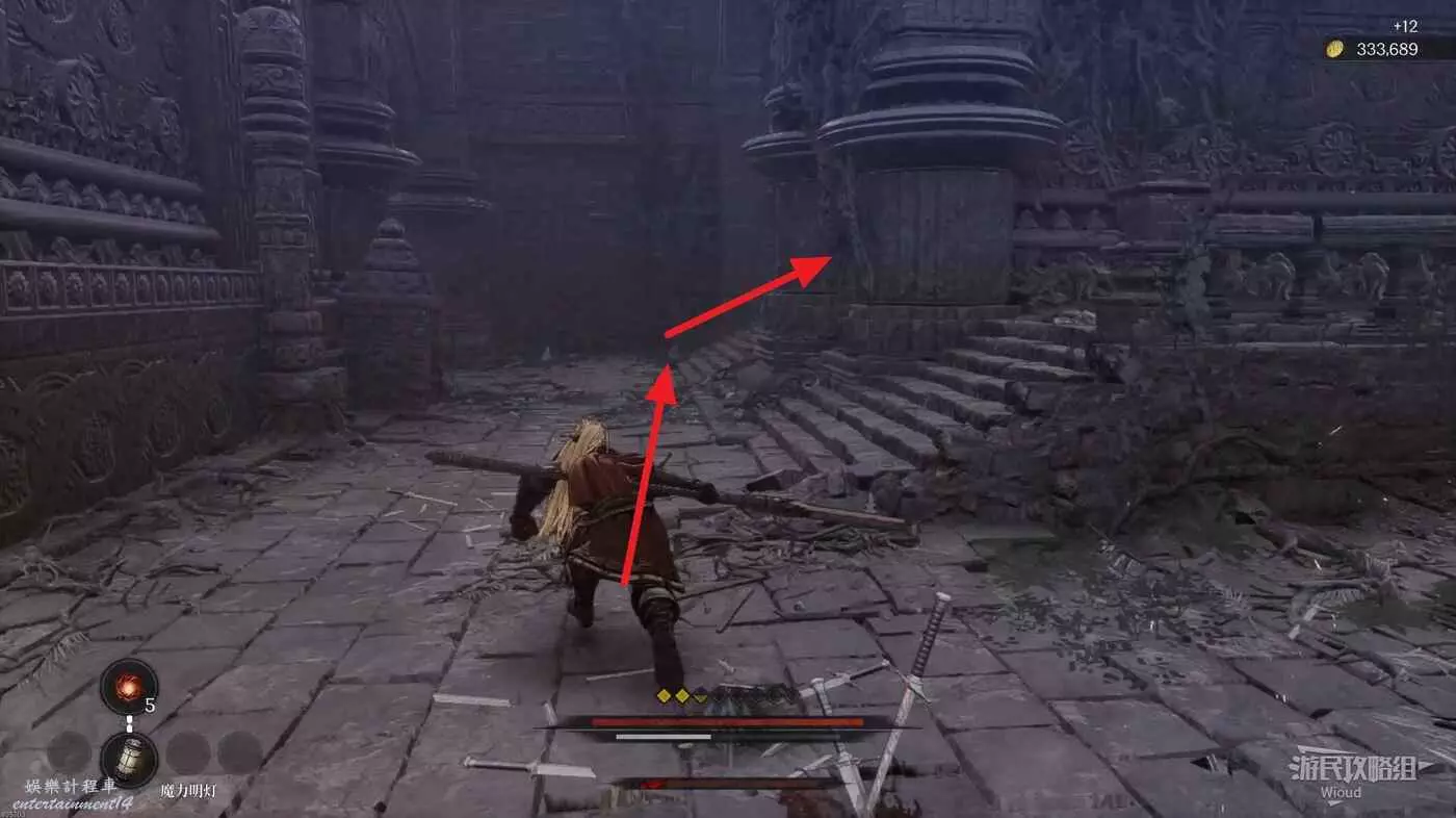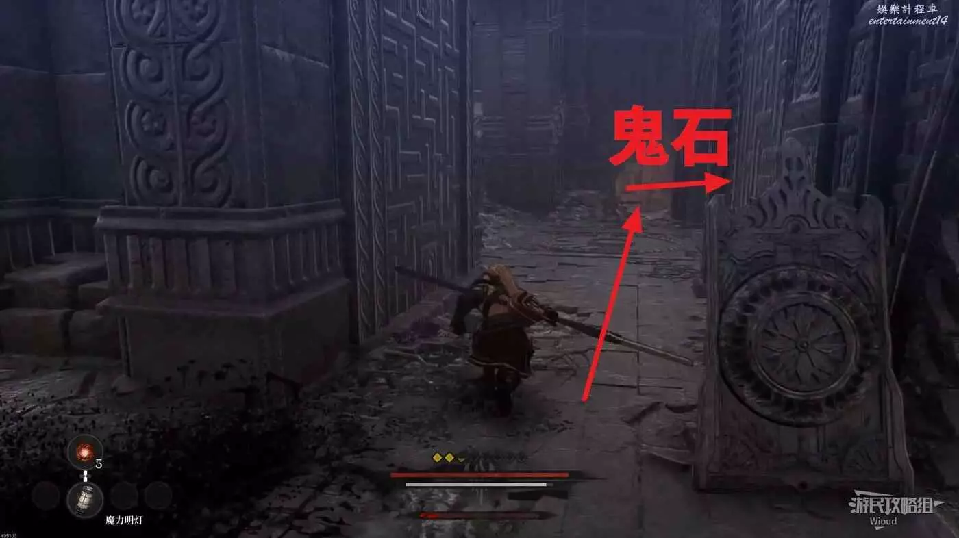 爬左側區域的樓梯上去往右看,右側雕像手上托著一個【鬼石】,雕像左側還有一個道具素材可拿。