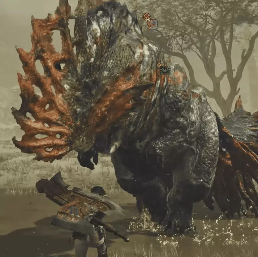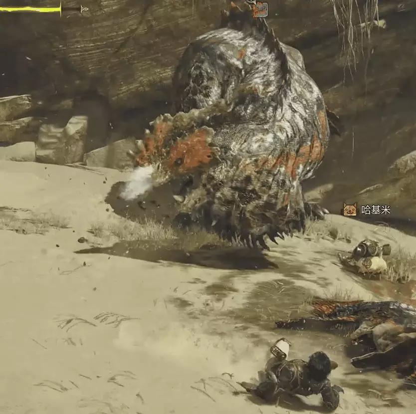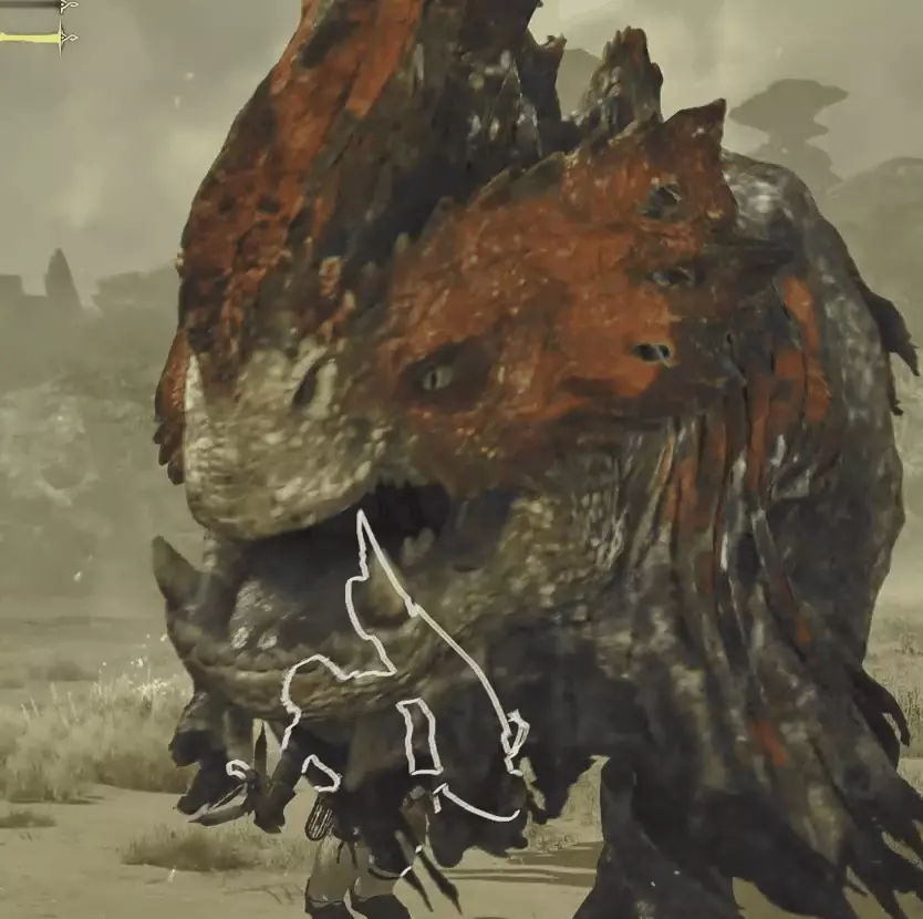 炎尾龍一邊張大嘴巴一邊抬高腦袋,看到這個前搖立刻遠離炎尾龍朝向區域,前搖結束後炎尾龍會直接朝目視方向咬一口。