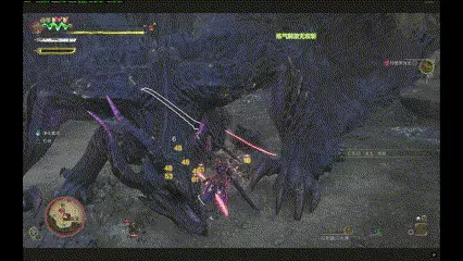 由於黑蝕龍的單怪特點,這裡我們的戰鬥思路大致為用各種升刃手段儘快開到紅刃,然後主打赤刃1+氣刃1或赤刃1+上撈來處理招式,原則上紅刃狀態下少納刀,多用看破斬·旋處理。在小硬直間隙,我們的蹭刀連招原則上保持最多只打一個赤刃1+氣刃1+赤刃1(否則極有可能因貪刀挨打),就可以維持一個比較好的節奏,個人認為玩太刀節奏是很重要的,如果節奏亂了的話,可能出現一系列操作失誤的連鎖反應從而影響連招處理的連貫性,甚至影響整場狩獵的體驗。