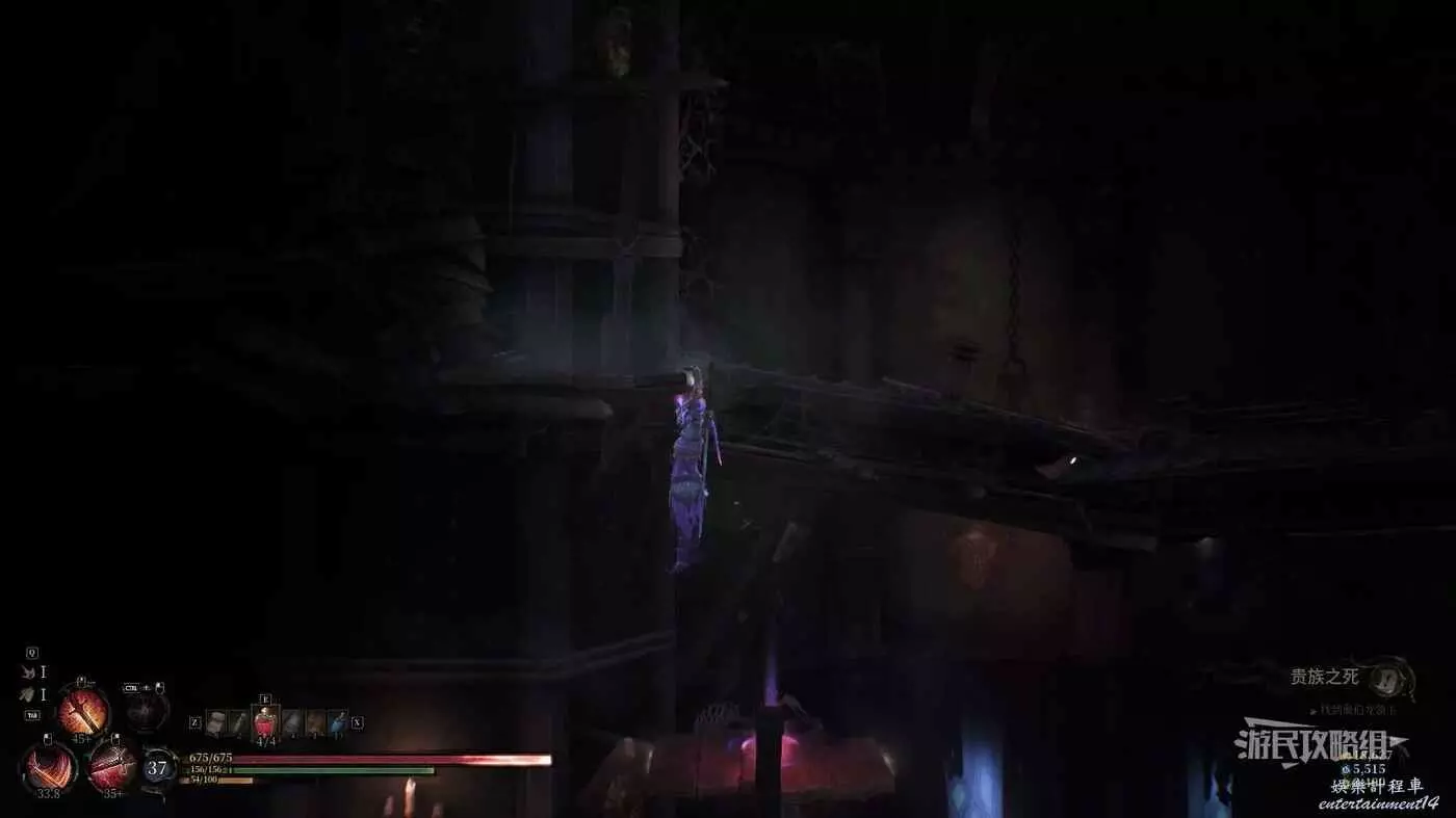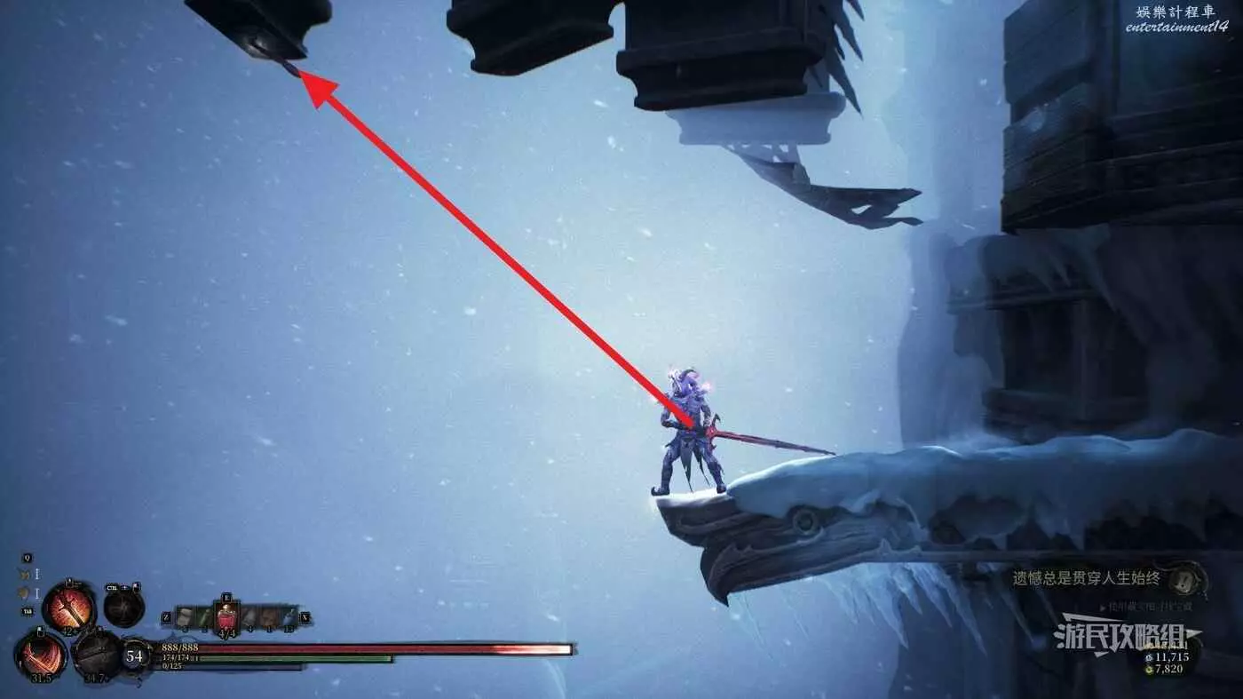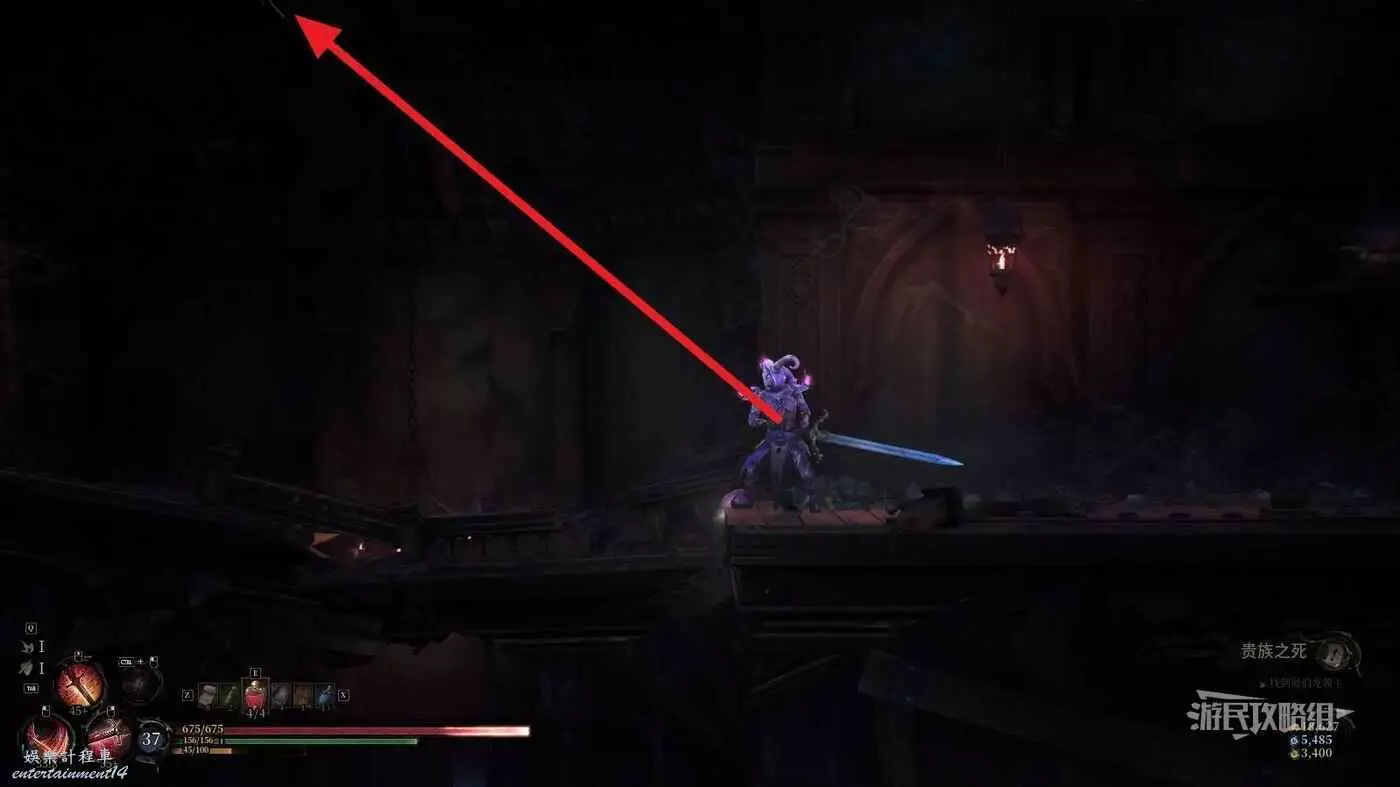 進入吸血鬼掛畫旁邊的隱藏道路,先是一個短平台,跳到下層長平台繼續往左走到頭,可以在左上方看到紅色布條,這裡用抓鉤蕩到左側平台。