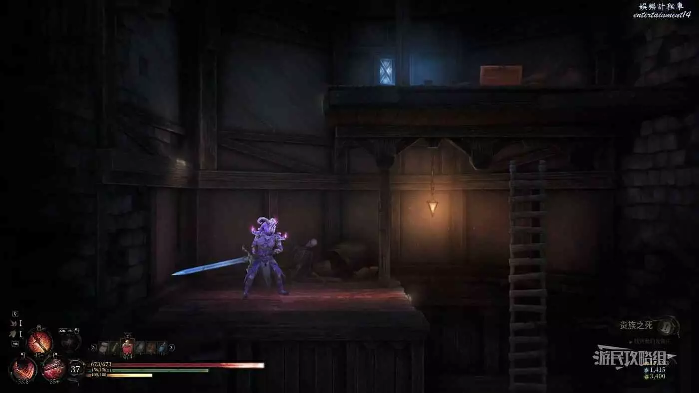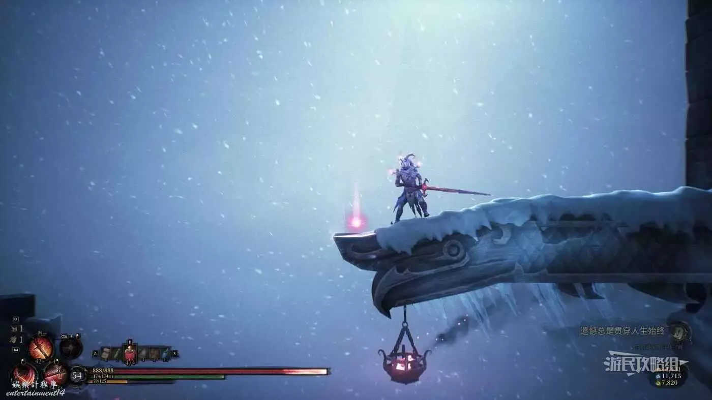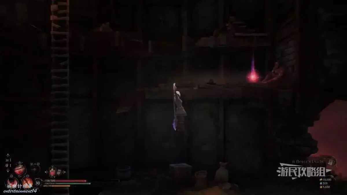 進入吸血鬼掛畫旁邊的隱藏道路,先是一個短平台,跳到下層長平台繼續往左走到頭,可以在左上方看到紅色布條,這裡用抓鉤蕩到左側平台。