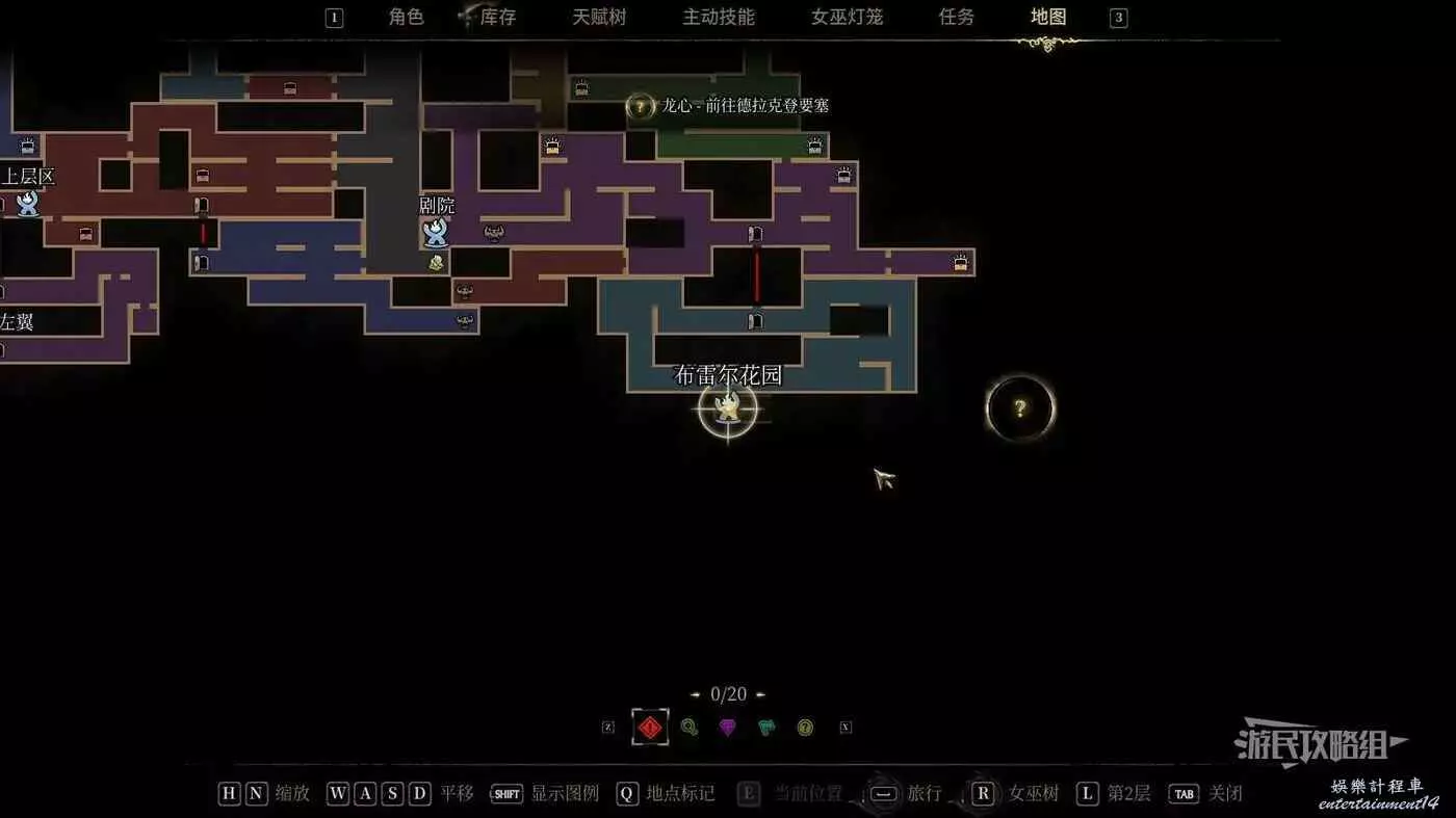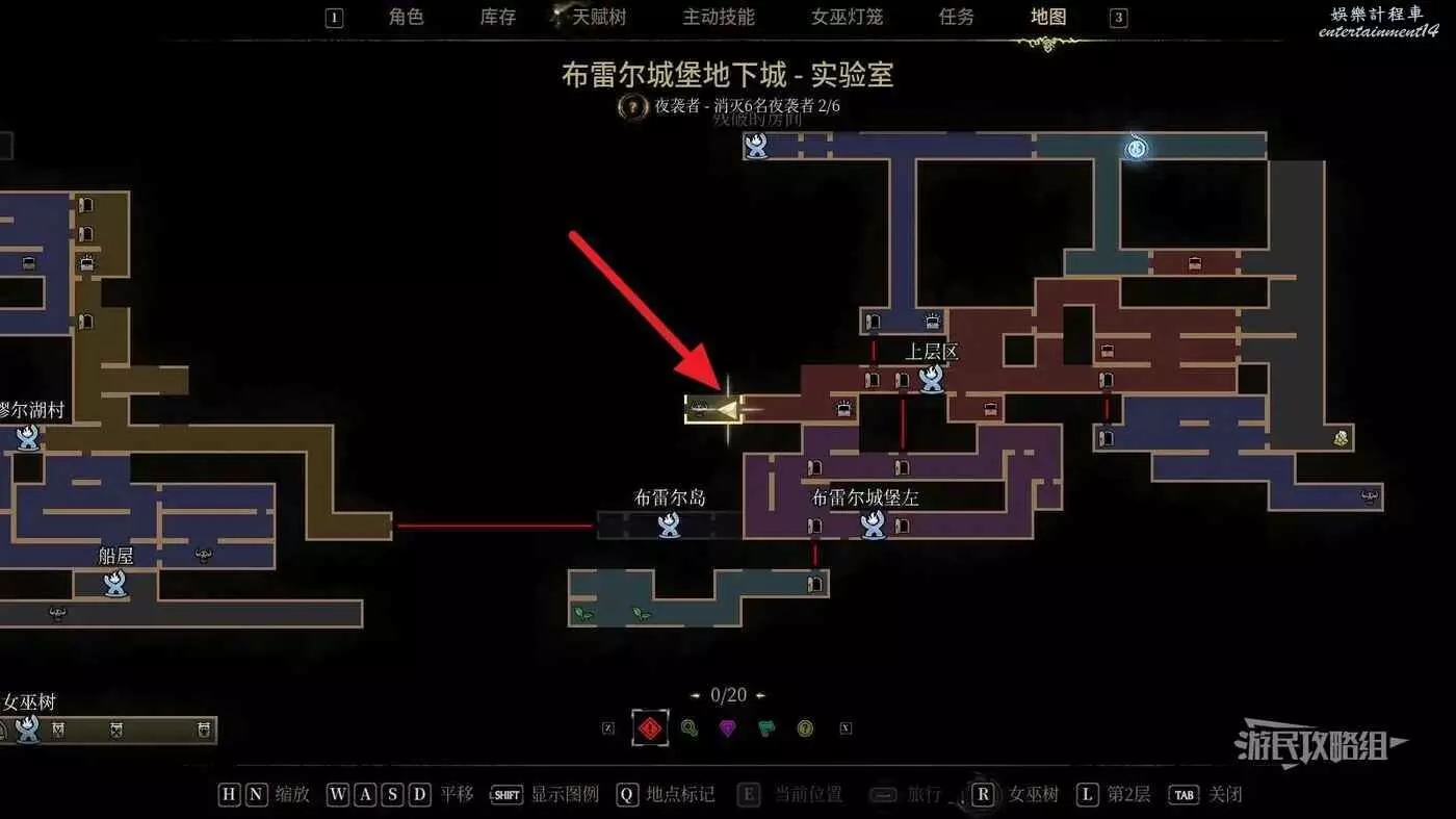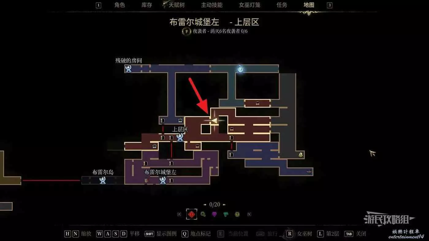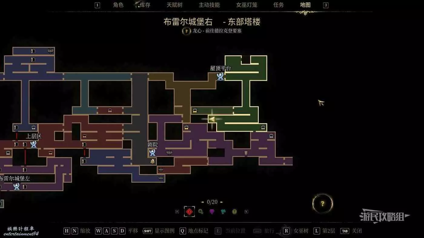 傳送到佈雷爾城堡左側女巫石,往左走,使用地牢鑰匙開啟柵欄門,進門。然後一路沿著跳台往左走,在有粉色燈光的骷髏旁邊就能看到這個地圖碎片。