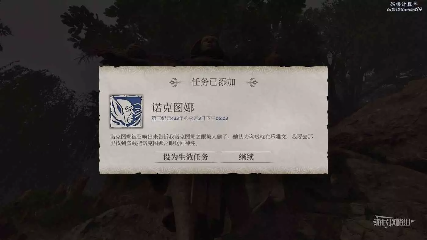 需要玩家角色等級達到10級,然後前往樂雅文(地圖右下方)北邊道路上的諾克圖娜神龕互動等待神諭結束即可觸發任務【諾克圖娜之眼】。