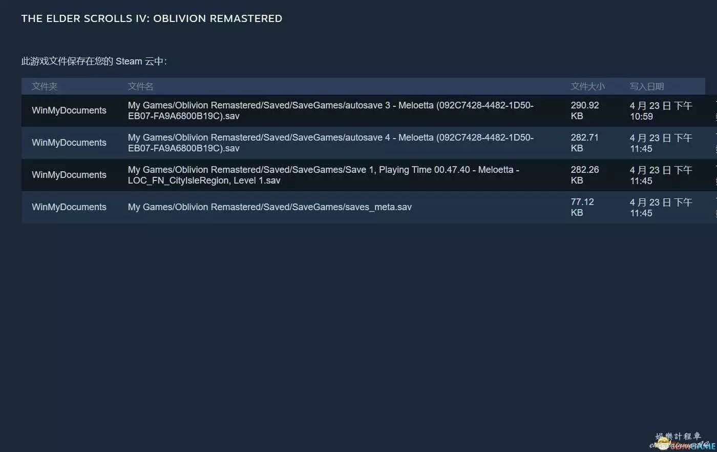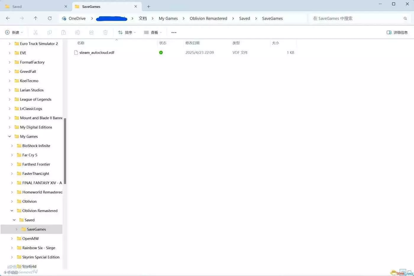 我開著onedrive同步,使用者文檔路徑是”C:\Users\xxx\OneDrive\Documents”,我的存檔應該會在”C:\Users\xxx\OneDrive\Documents\My Games\Oblivion Remastered\Saved\”我其他遊戲包括原版滾4滾5都是正常的,steam也確實在這個路徑生成了雲存檔檔steam_autocloud.vdf