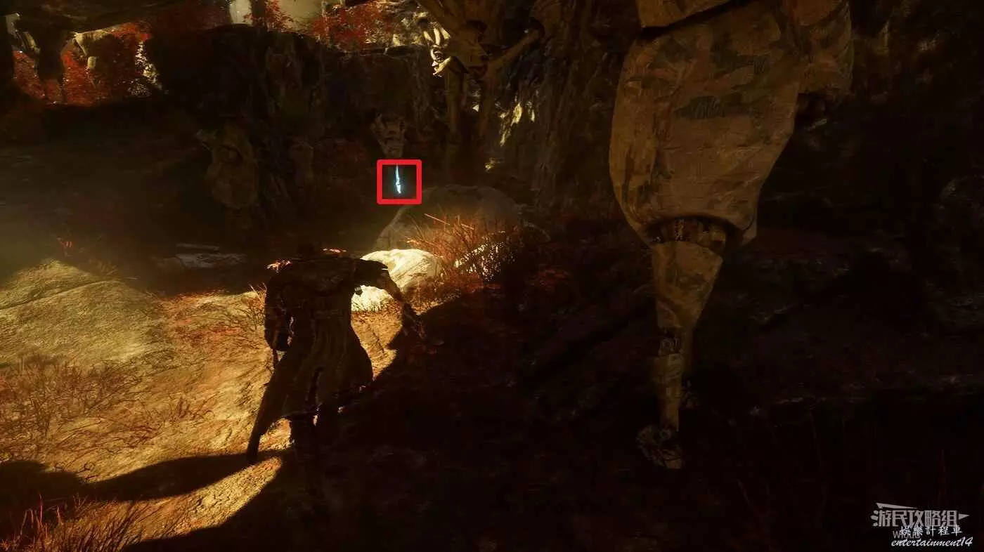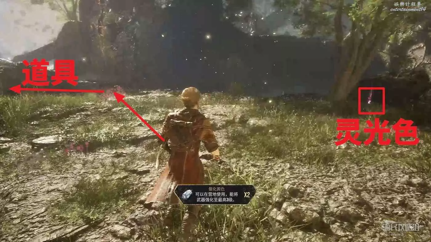 回到篝火處往右走,不遠處有個大塊頭敵人,敵人右側樹下可以撿到一個【靈光色】。