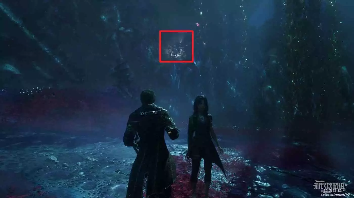 移動到機關2的位置,面朝機關方向,下圖紅框所示位置可以找到第3個機關,位於牆壁右側面。