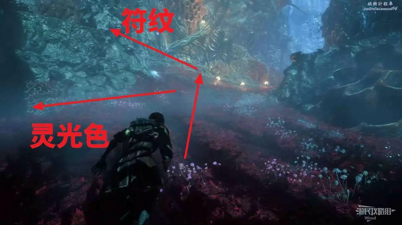 經過燈籠海藻樹,貼著左牆走到一個過道,走進去立即左拐,盡頭可以找到符紋【回報標記】,回到過道門口進去右拐可以拿到一個【靈光色】。