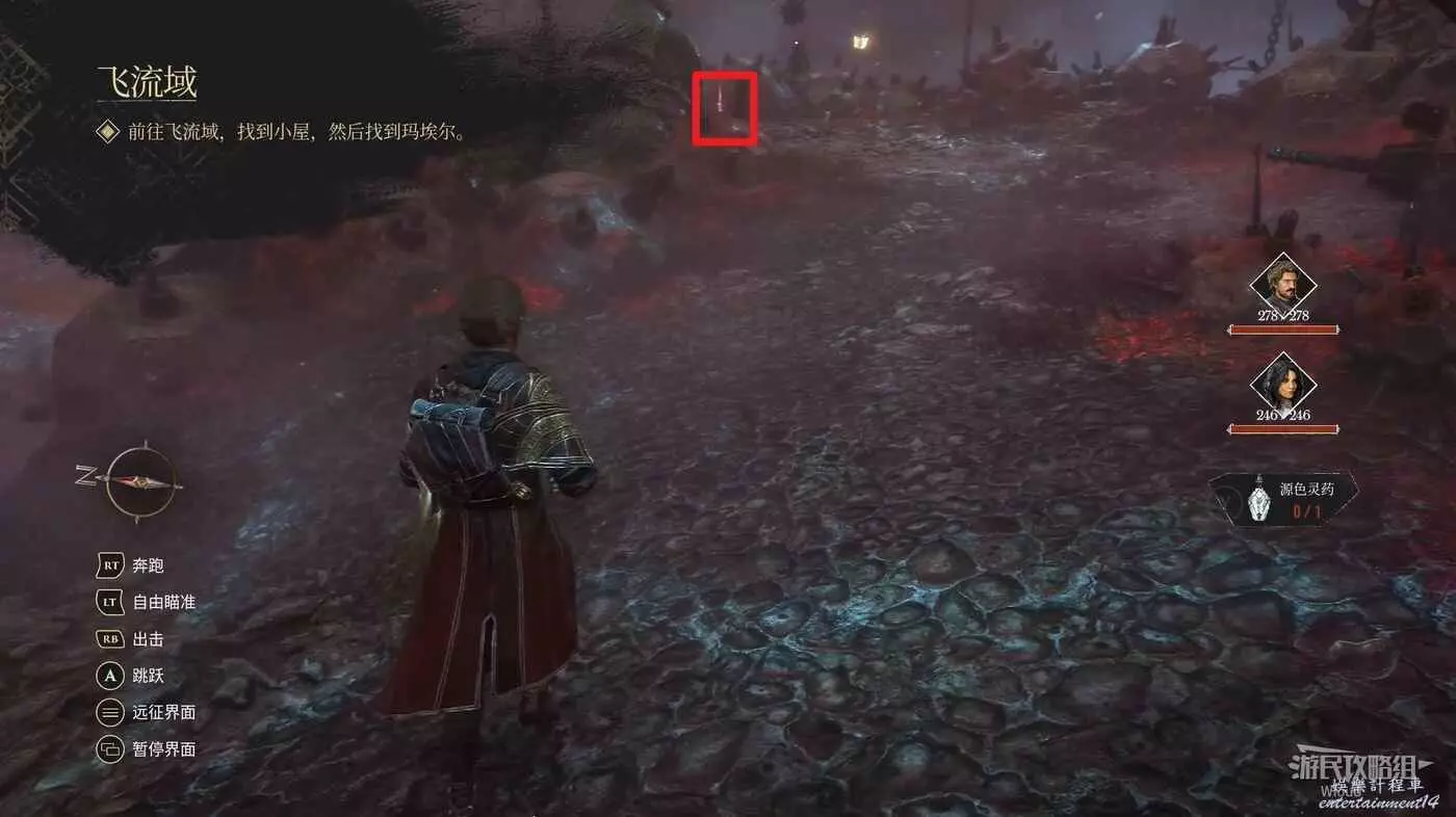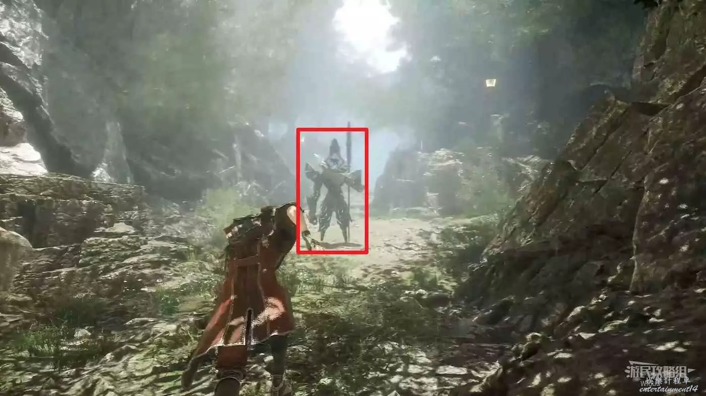 商人靠下的位置,有三個敵人位於紅框位置,此處廢墟旁有個靈光點可拿。
