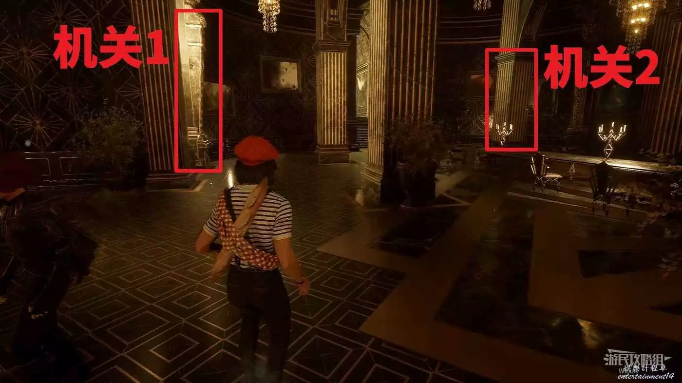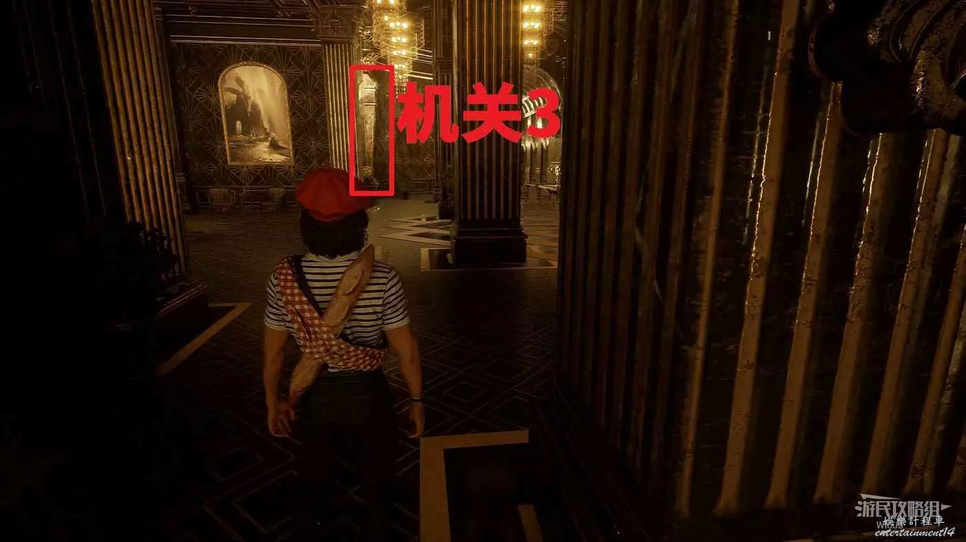 餐廳前方大門,右側紅框所示的柱子可找到機關2。