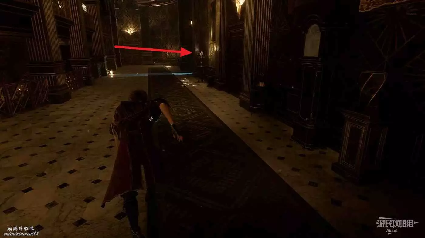 沿著旗幟旁的過道走到一個T字路口,往右拐,貼著右牆走。