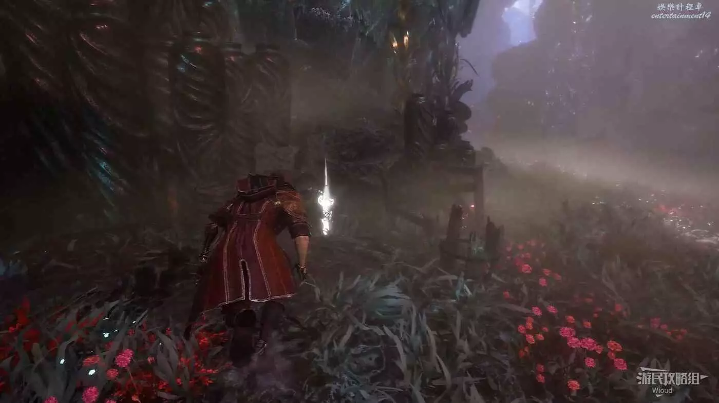往左側水藻過道走到盡頭,爬樓梯上去找到一個默偶,將其擊敗獲得瑪埃爾的短髮裝束,默偶後方道具點可拿一個【靈光色】。