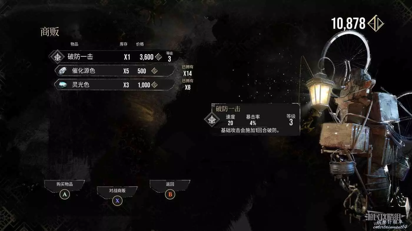 最後與劇情裡出現的刷頭精對話,此處可以購買三個靈光色,通過下面的按鈕提示與商販對戰並獲得勝利,解鎖符紋【破防一擊】的購買許可權。