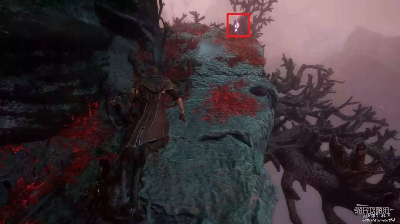 右側爬繩子上去,走到頭可以撿一個【靈光色】,然後跳到第一個遠征隊旗幟的位置,傳送到第二個旗幟再次走到狗洞T字路口,往左走。