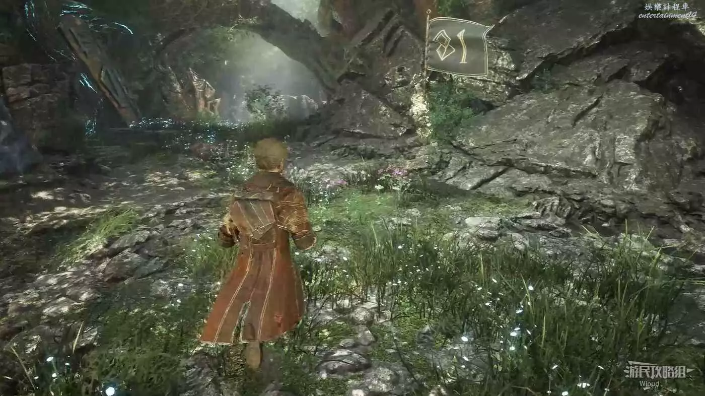 繼續走,啟動第二個遠征隊旗幟,旗幟位置貼著右牆繼續走,右側散發藍光的位置可以撿到符紋【踉蹌攻擊】。