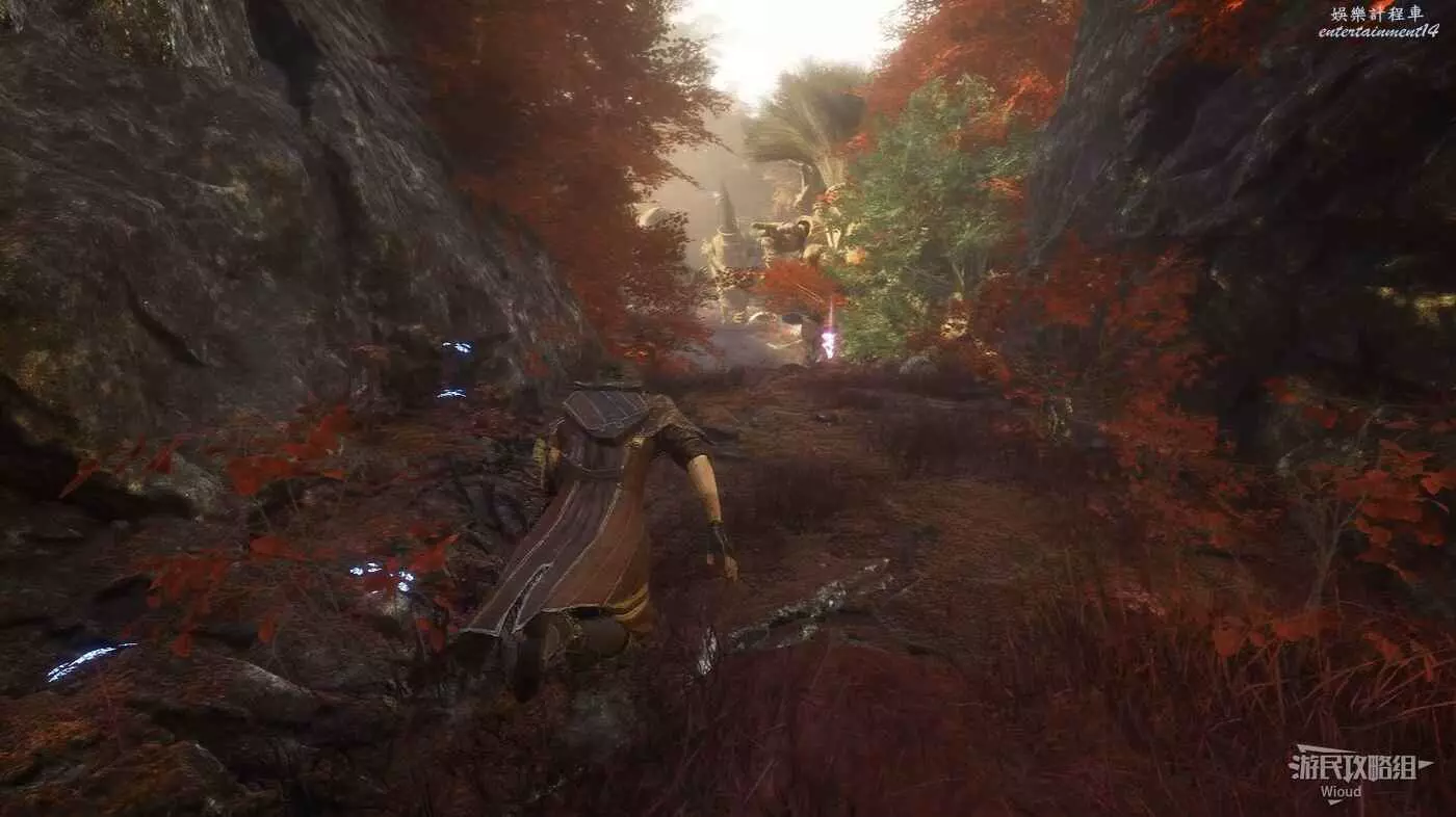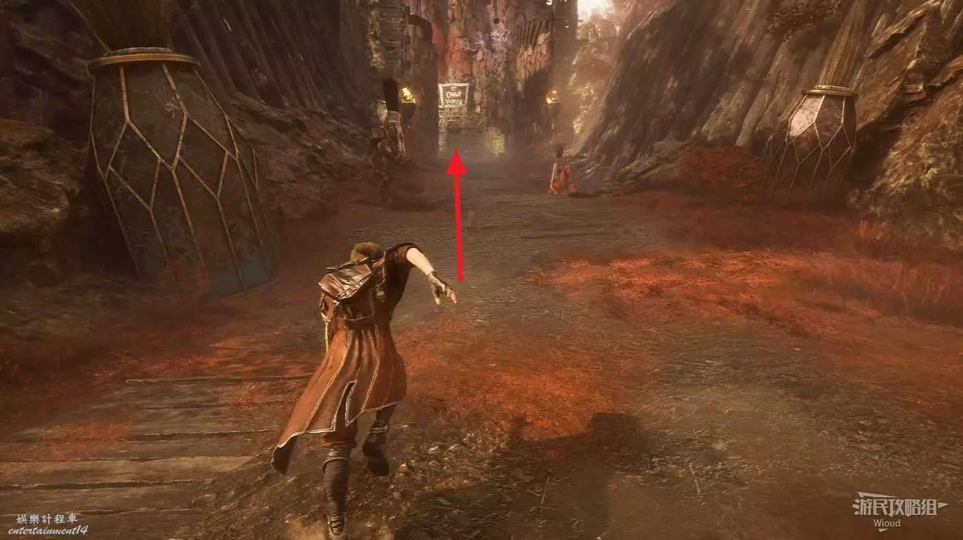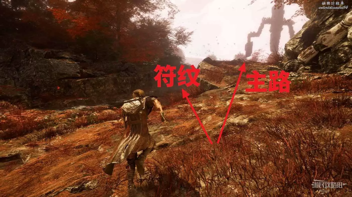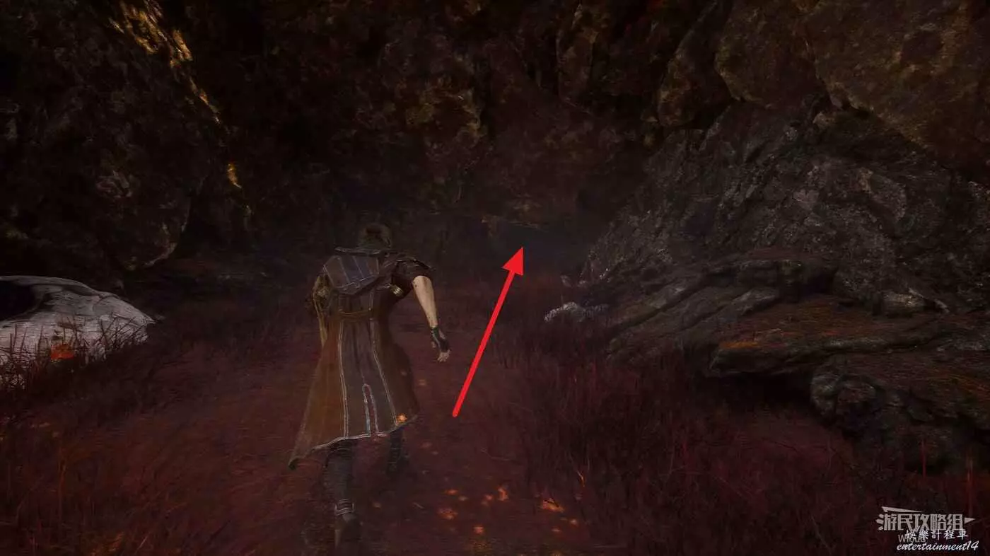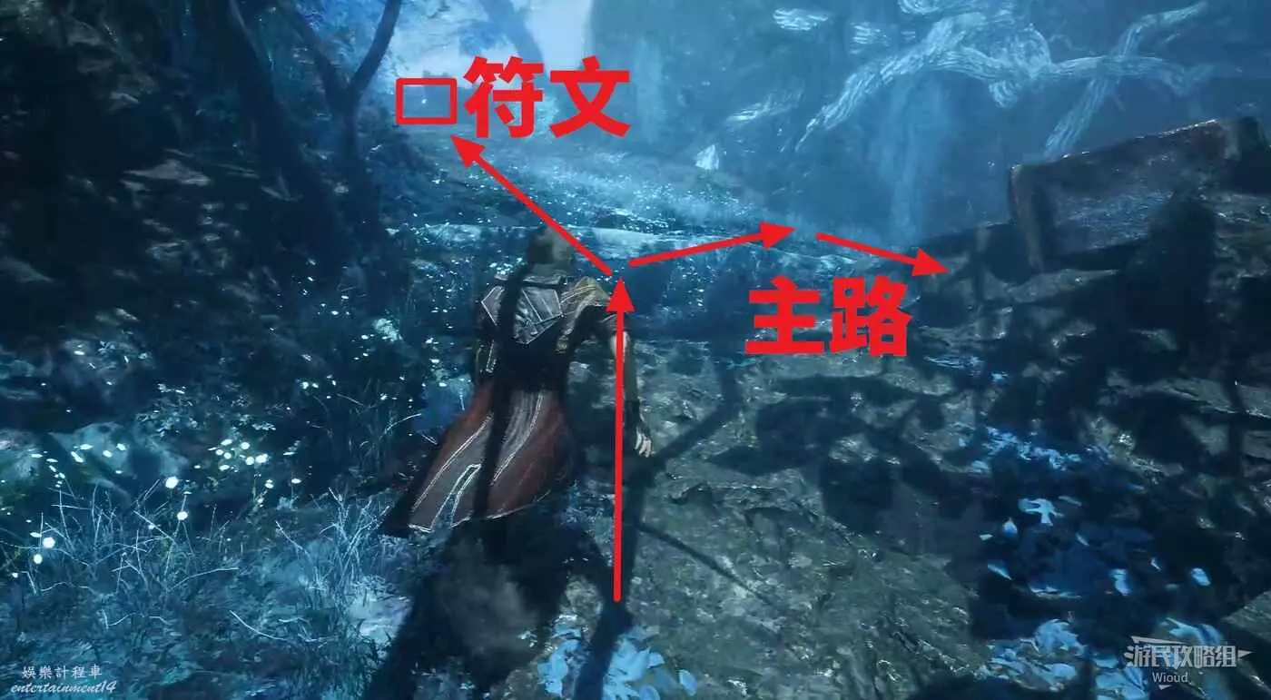 回到通道出口往左走,岔路口直走,左前方白點可拿到符紋【燃燒射擊】,然後沿著右側主路往下走。