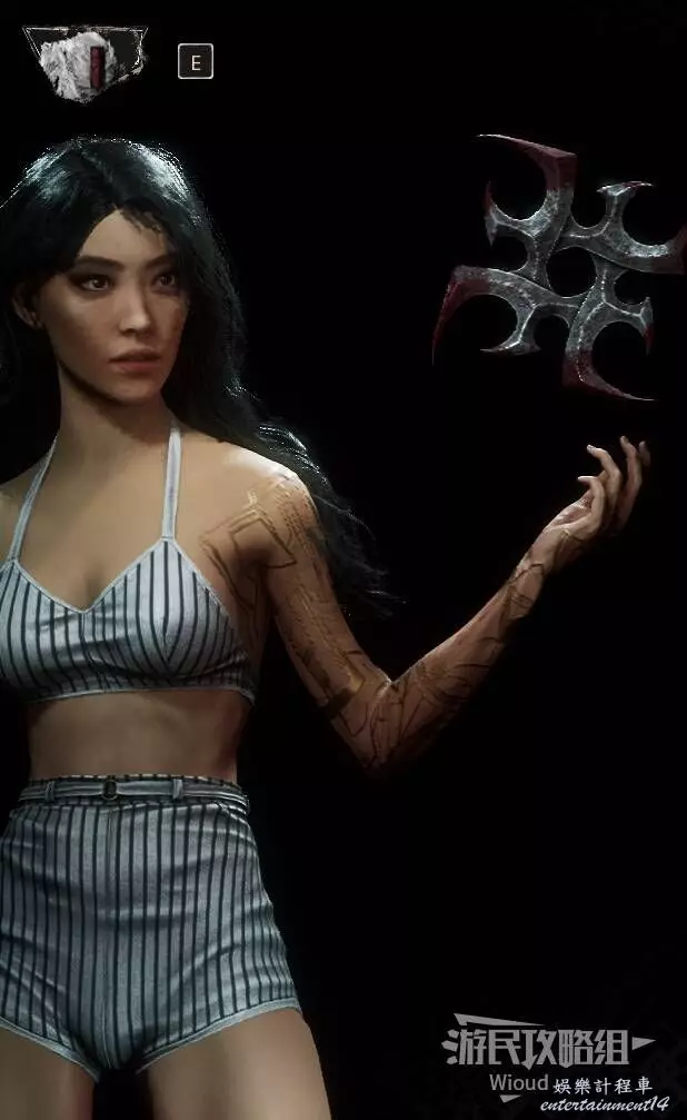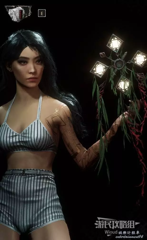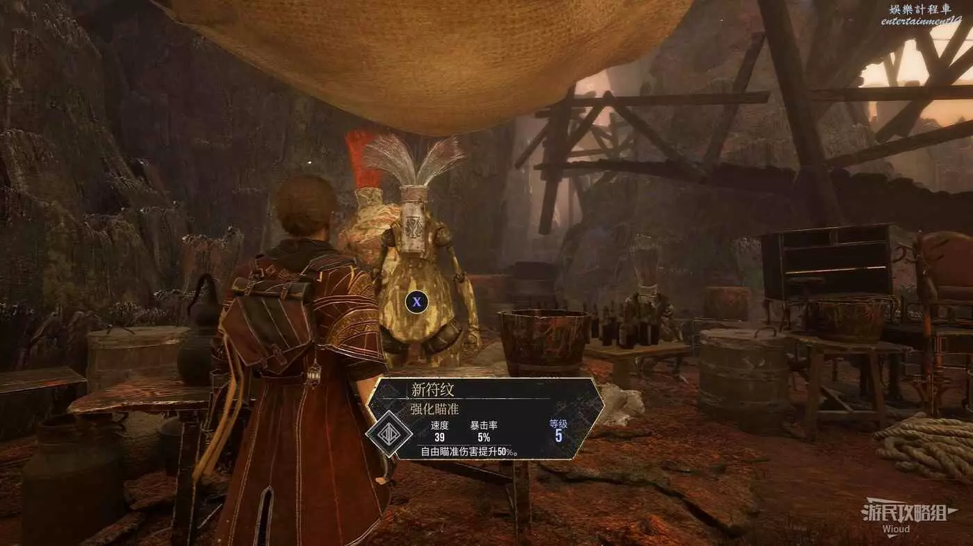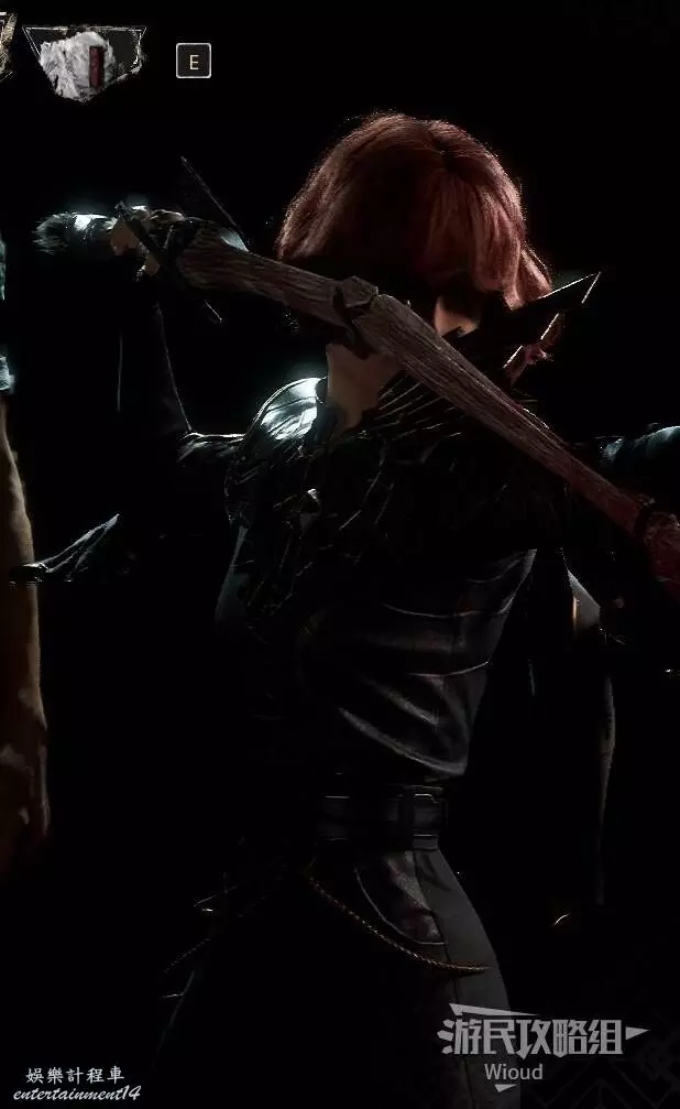 拾取道具後,原地轉頭後看,沿著柱子上的梯子爬上去,使用鉤爪到對面平臺走到頭,可以找到符紋【強化瞄準】。