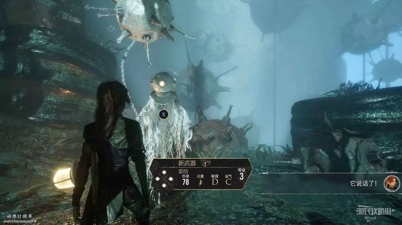 從對面出口回到剛才的開闊區域,通過壺口回到雷靈的位置,將剛才撿到的水雷交給它獲得武器【雷結】。