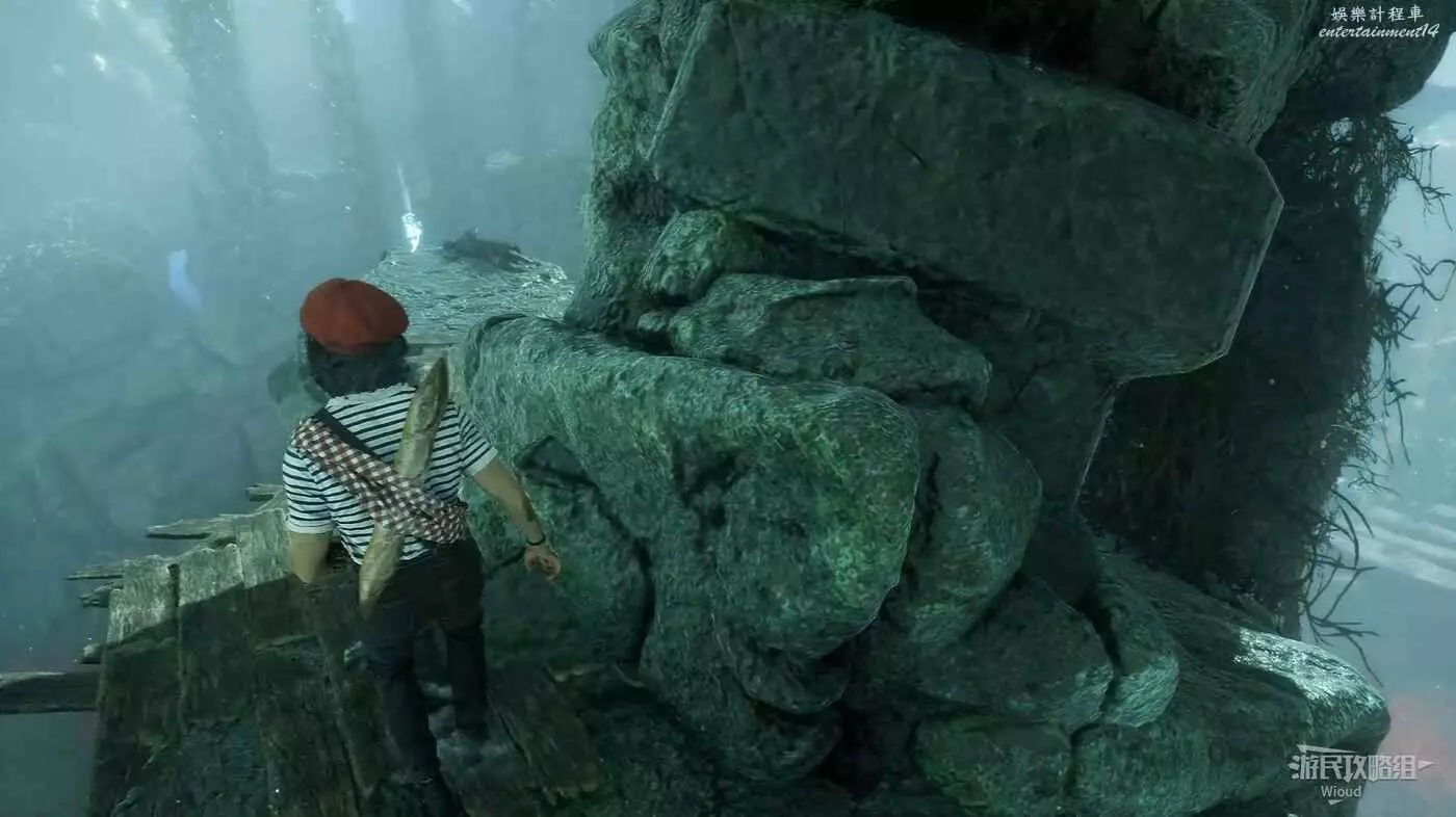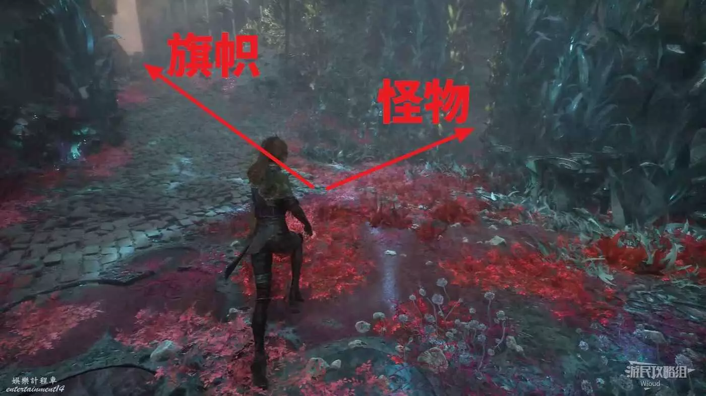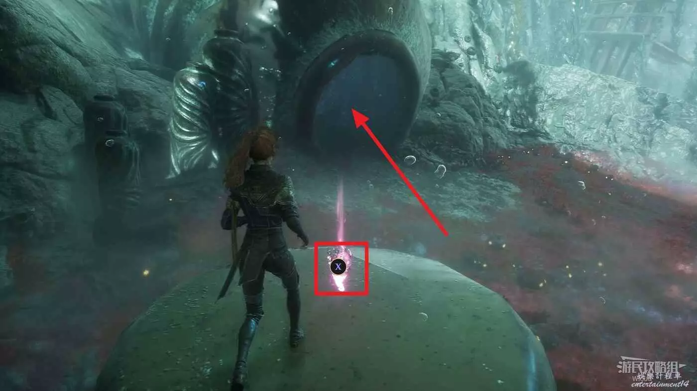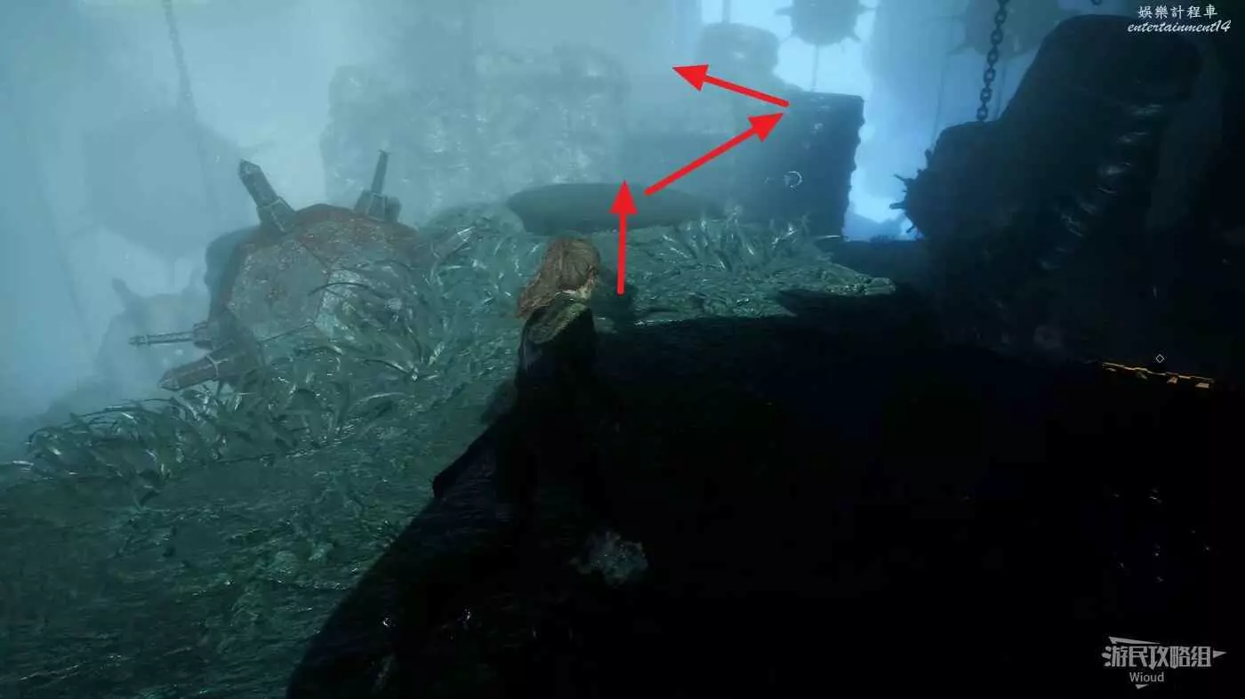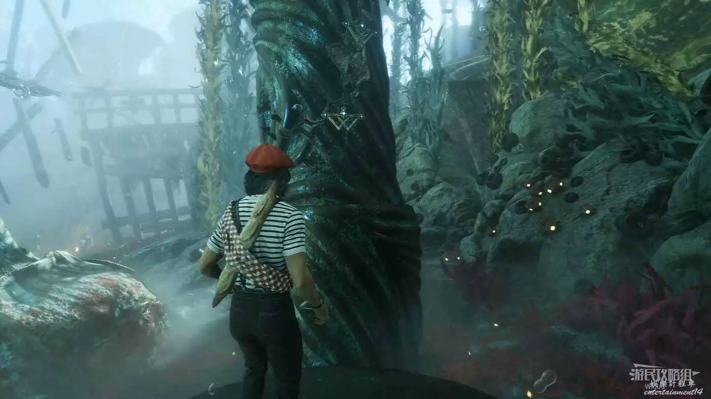 回到路口往右走,爬梯子上去,前進時注意找右側一個全是水藻的過道入口,找到後不著急進去,先直走啟動前方的遠征隊旗幟,再回來進入右側過道。