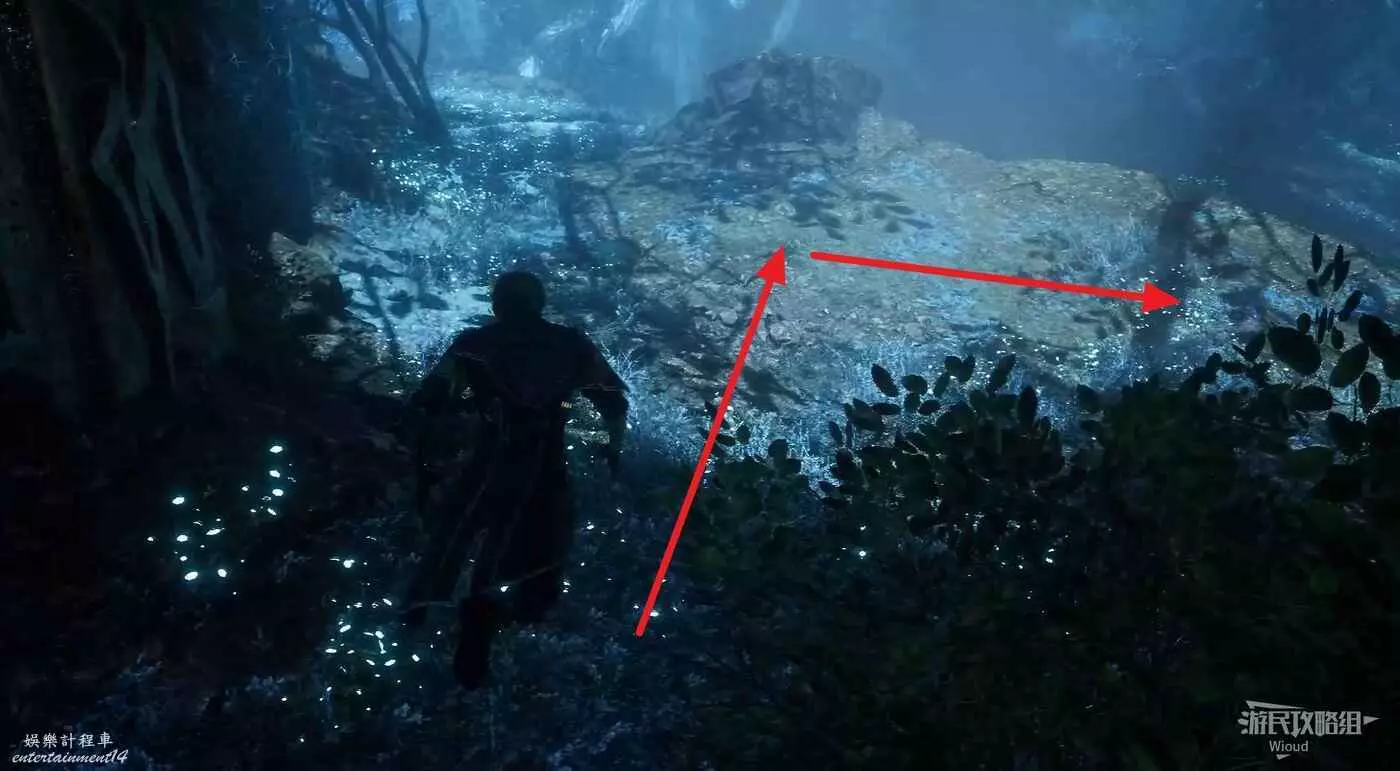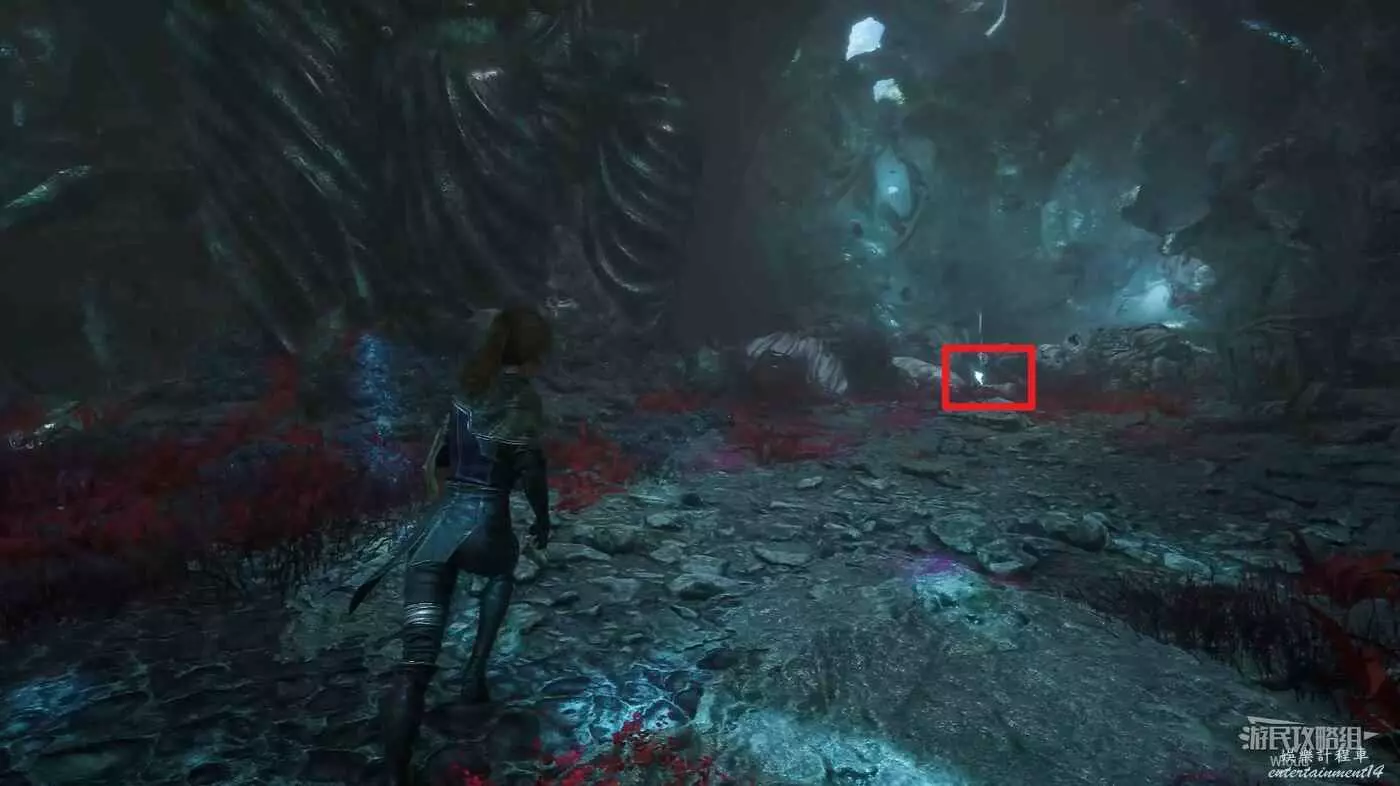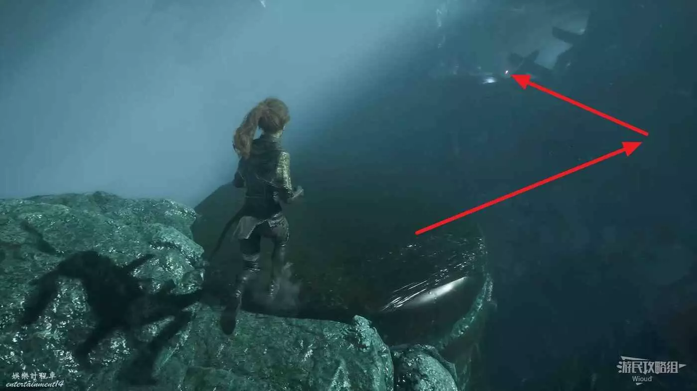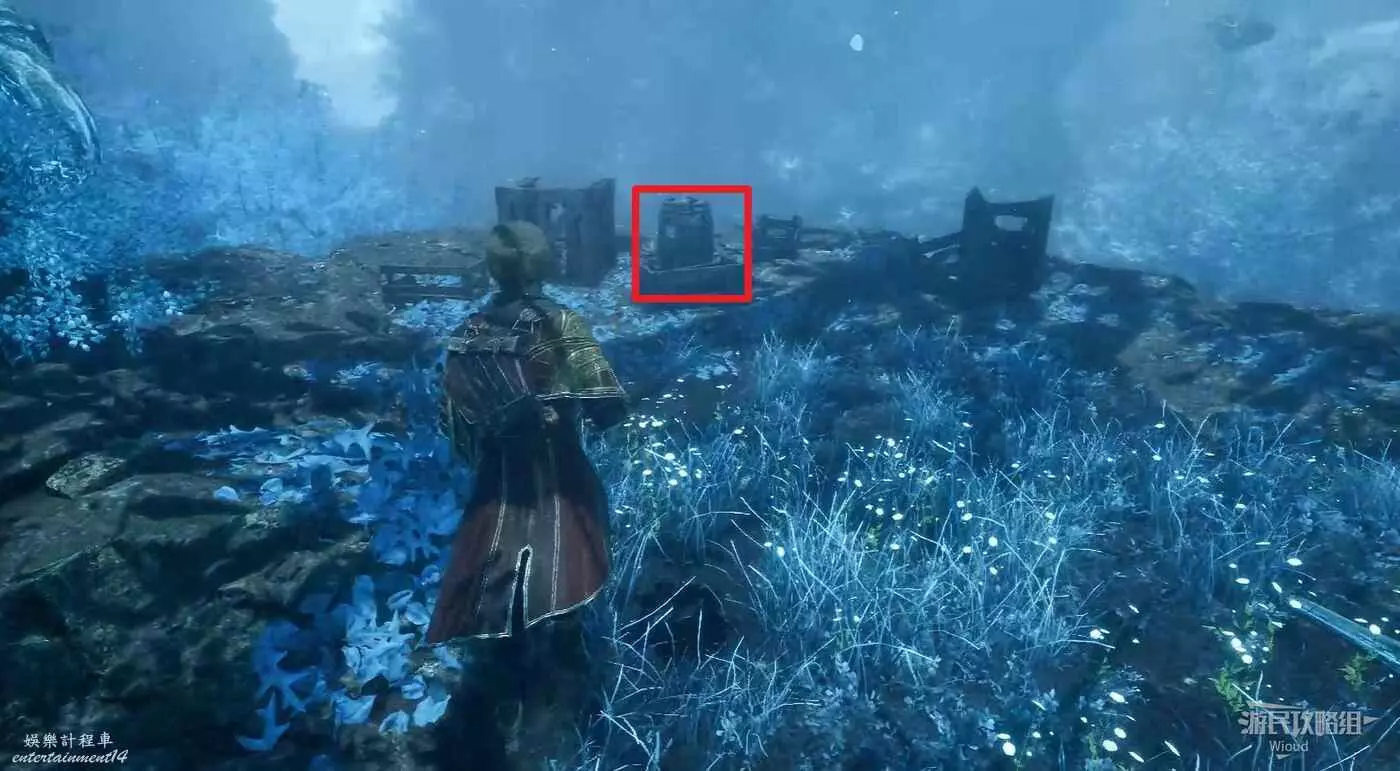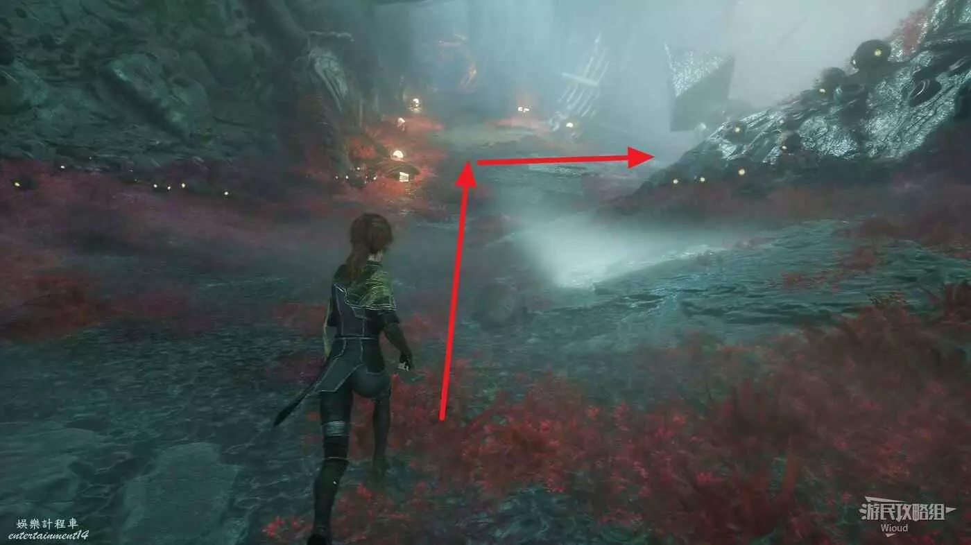 回到路口往右走,爬梯子上去,前進時注意找右側一個全是水藻的過道入口,找到後不著急進去,先直走啟動前方的遠征隊旗幟,再回來進入右側過道。